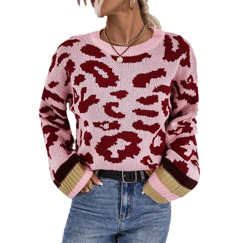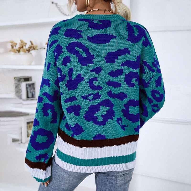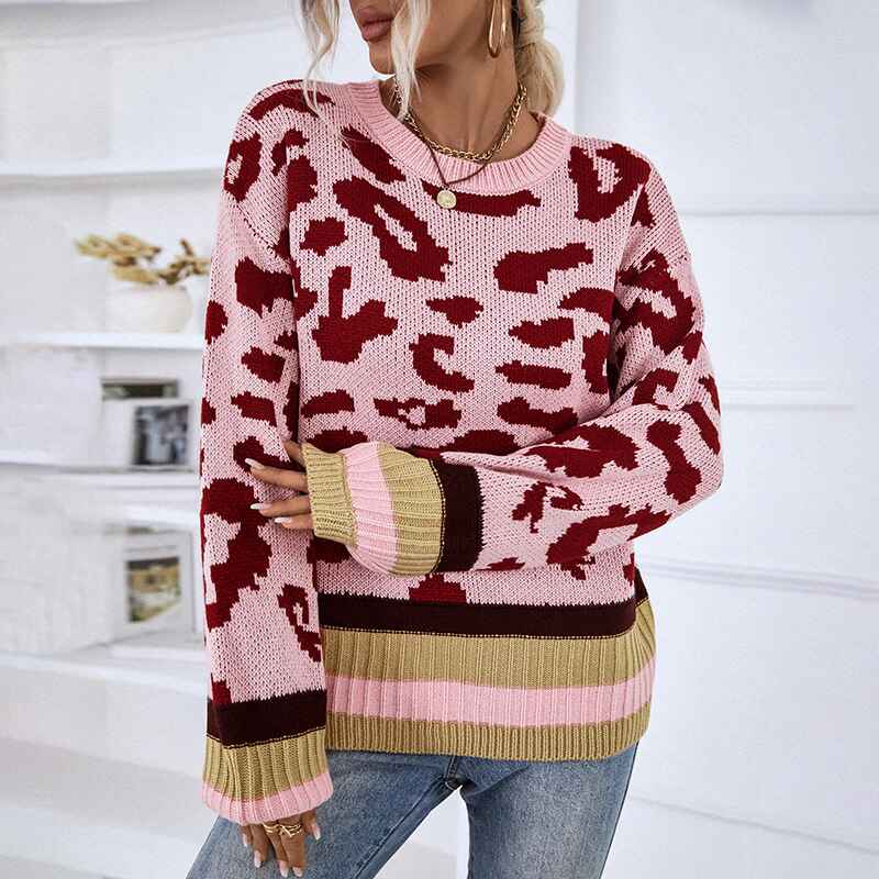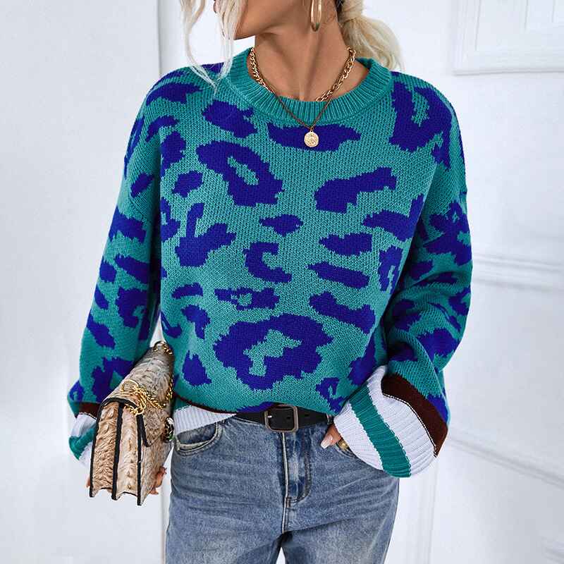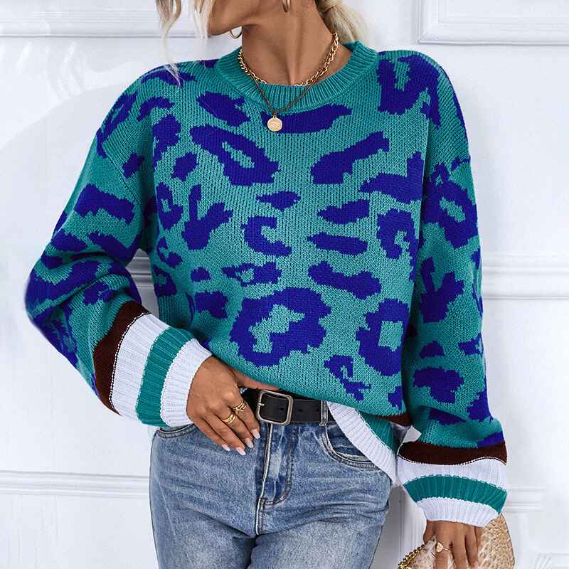 Women's Leopard Pullover Sweater Casual Sweatshirt Crew Neck Long Sleeve Knit Tops K477