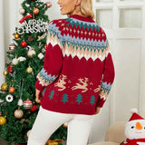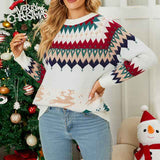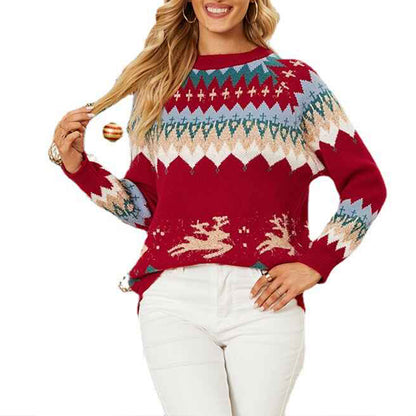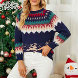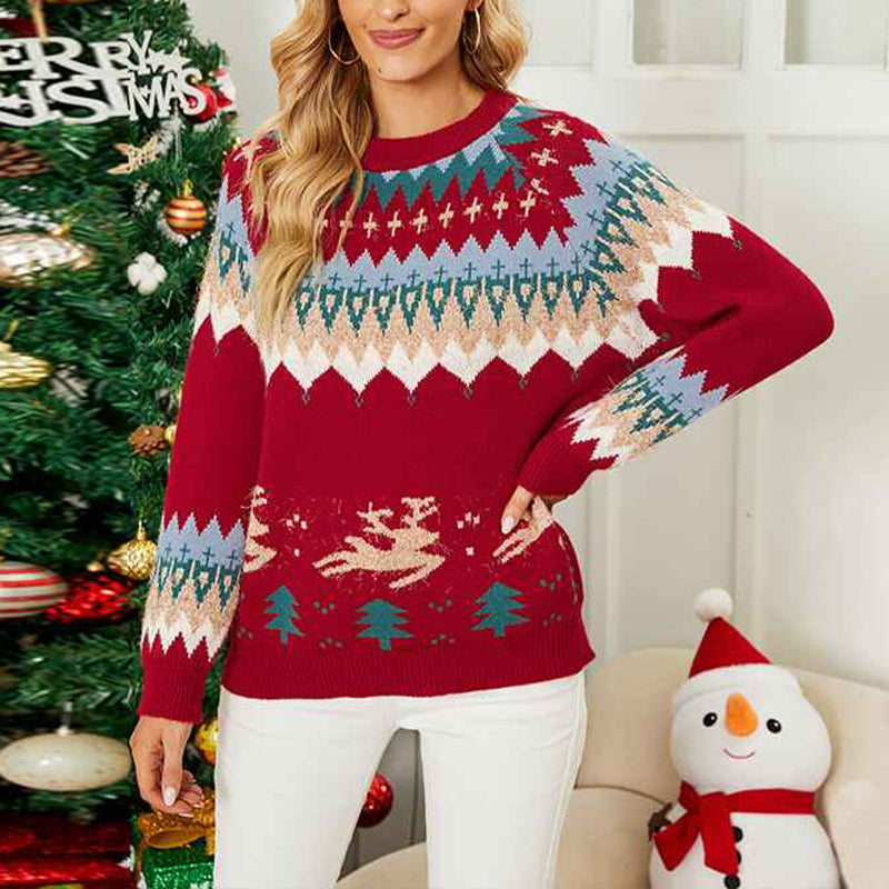 Women's Christmas Reindeer Xmas Snowflake Patterns Knitted Sweater Long Sleeve Elk Floral Printed Pullover K480