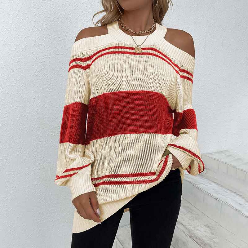 Sweaters for Women Halter Cold Shoulder Color Block Criss Cross V Back Chunky Knit Pullover Jumper Tops Tunics K270