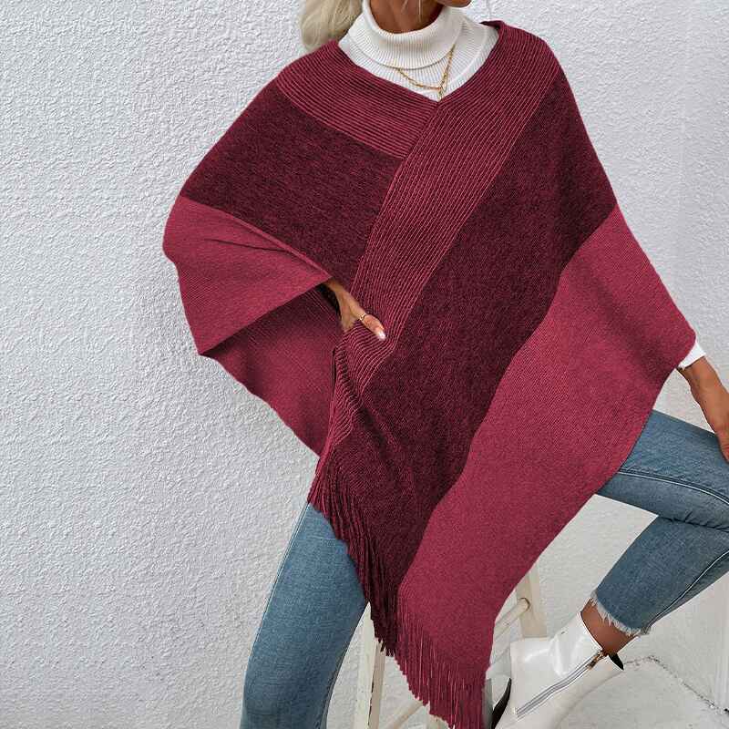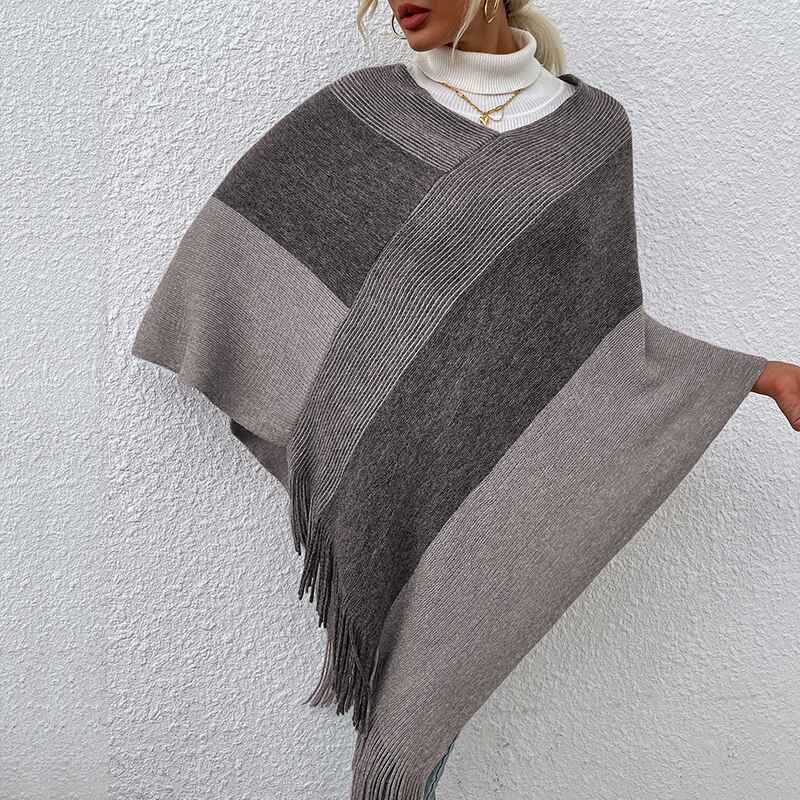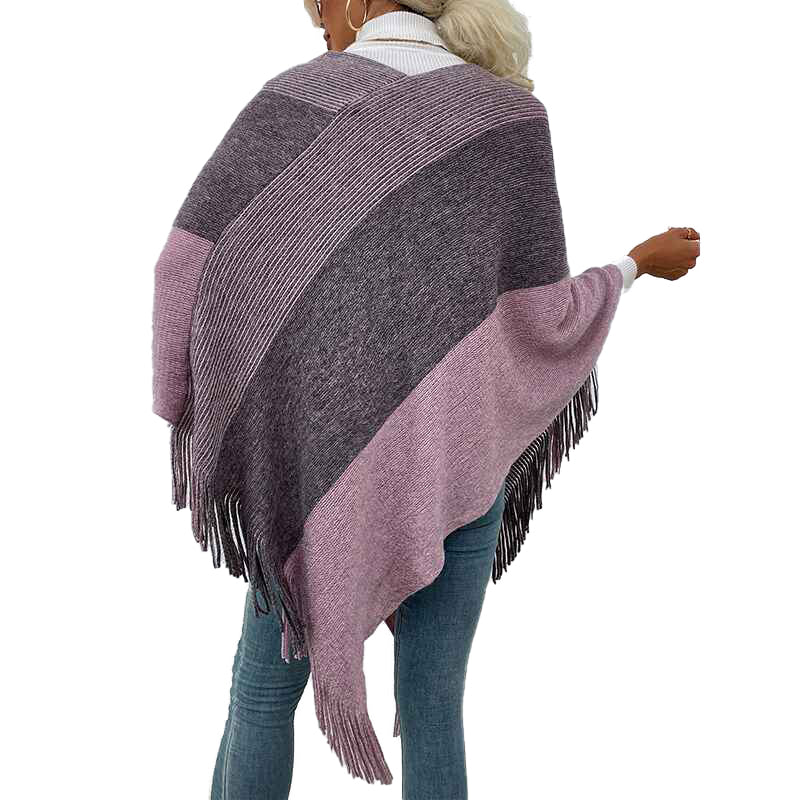 Women’s Elegant Knitted Poncho Top with Stripe Patterns and Fringed Sides K309