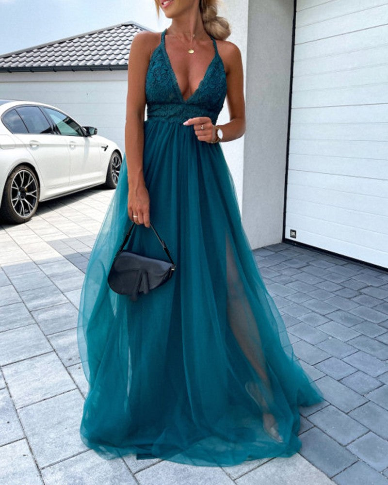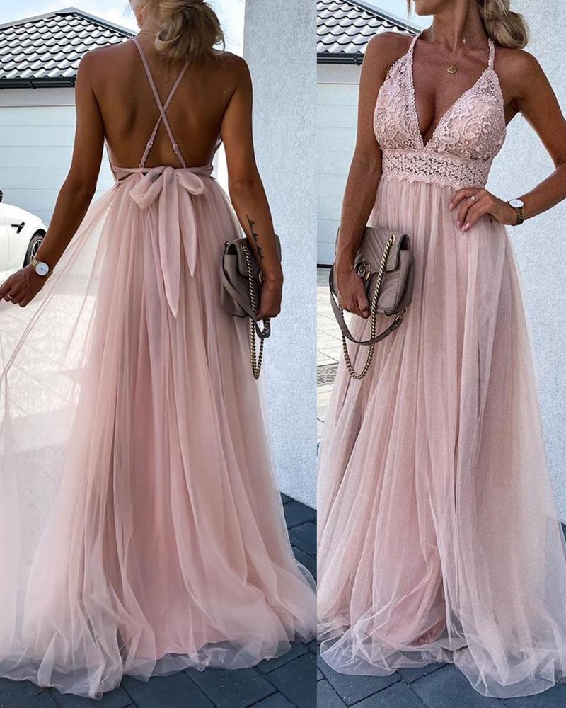 Crisscross Backless Crochet Lace Mesh Prom Dress
