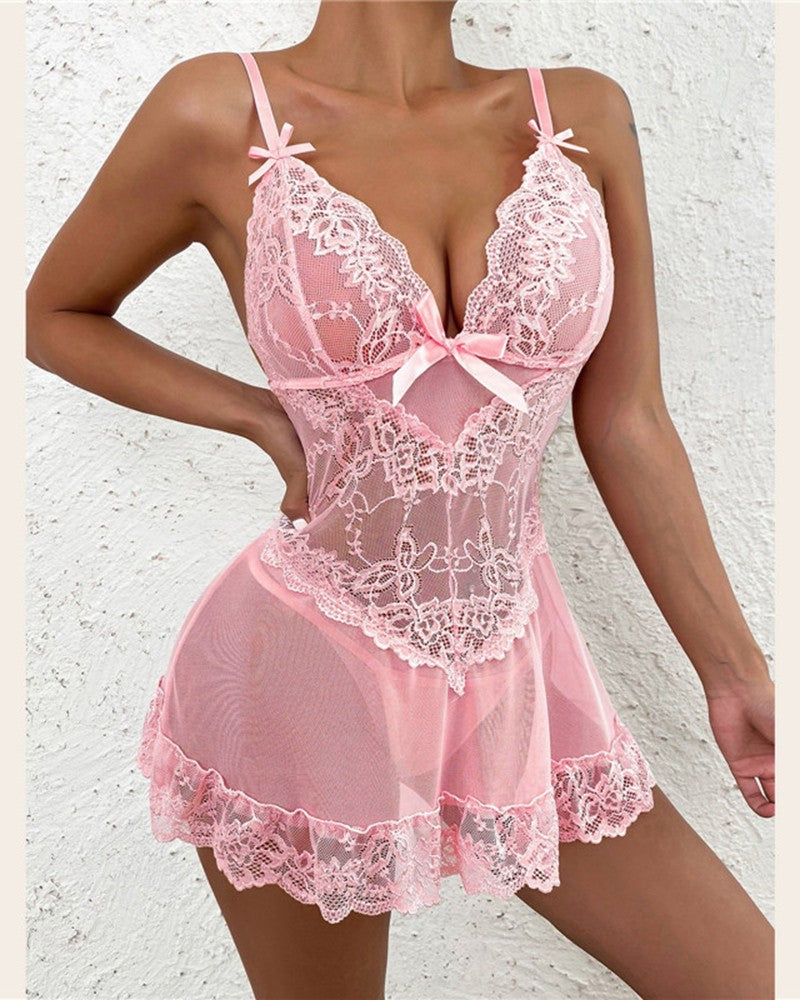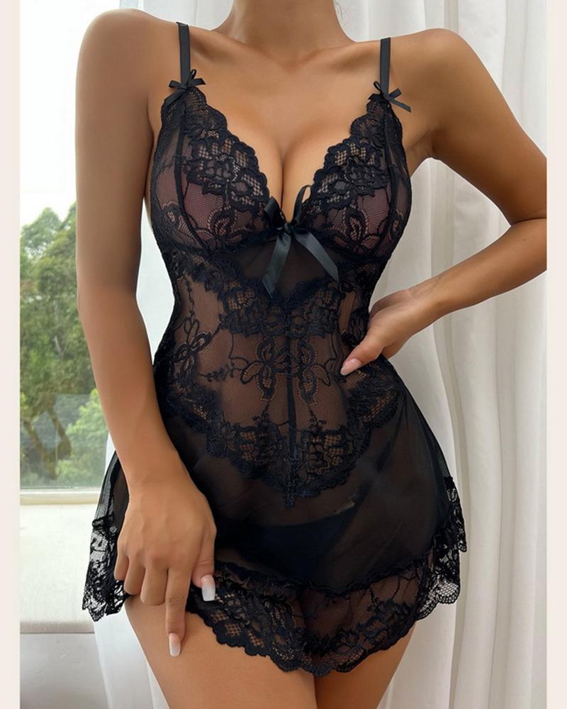 Crochet Lace Bowknot Decor Babydoll With Panty