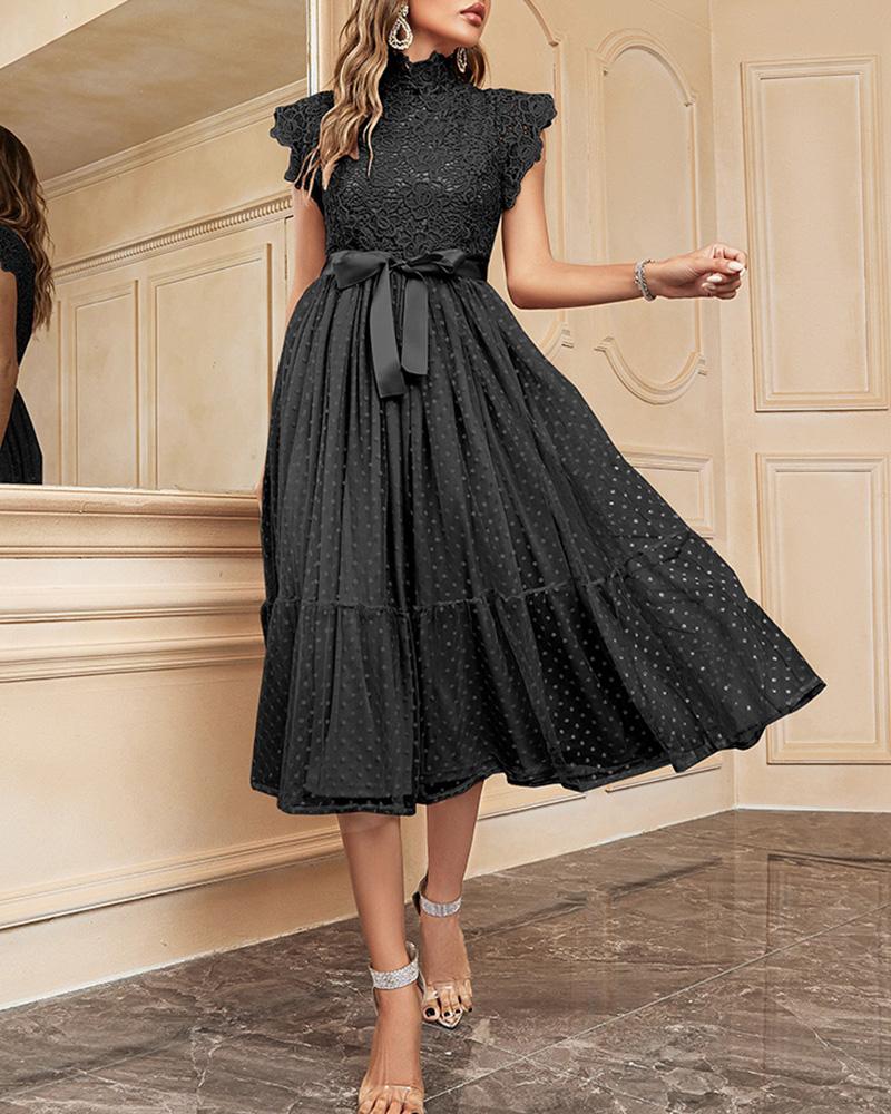 Crochet Lace High Neck Dot Mesh Casual Dress