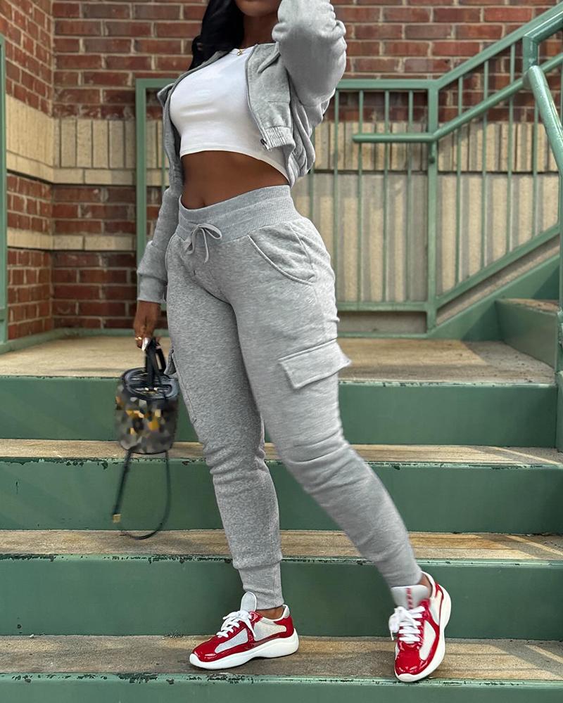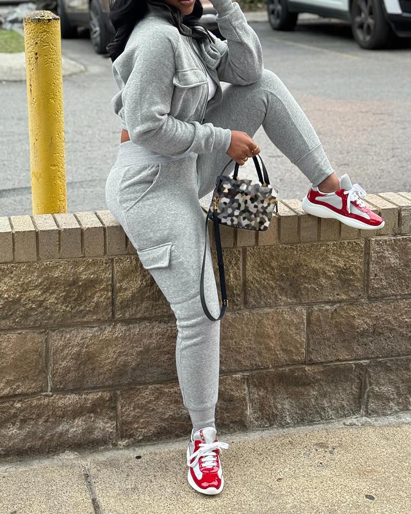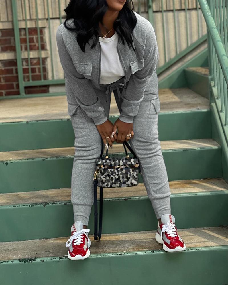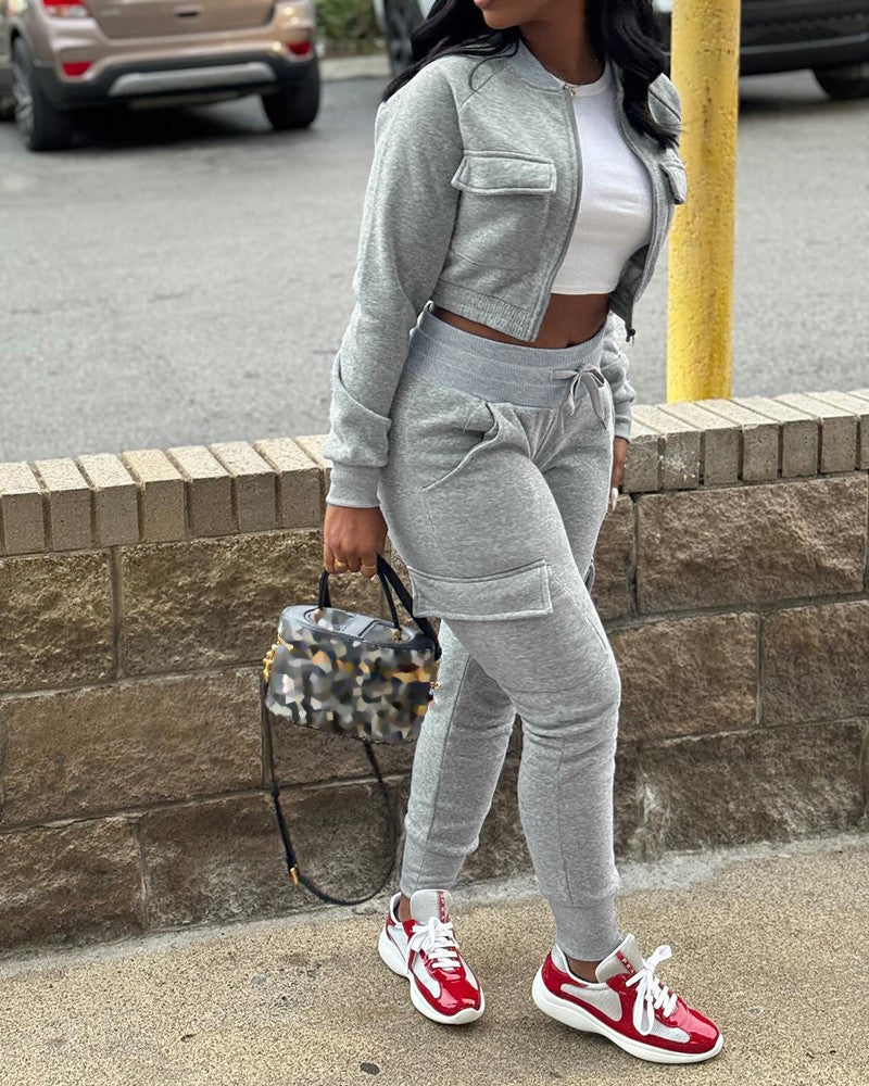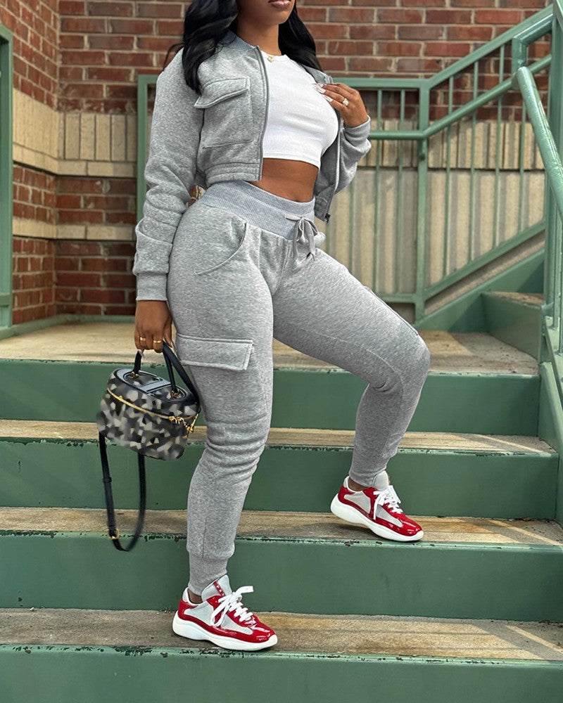 Crop Sweatshirt Jacket & Drawstring Cuffed Sweatpants Set