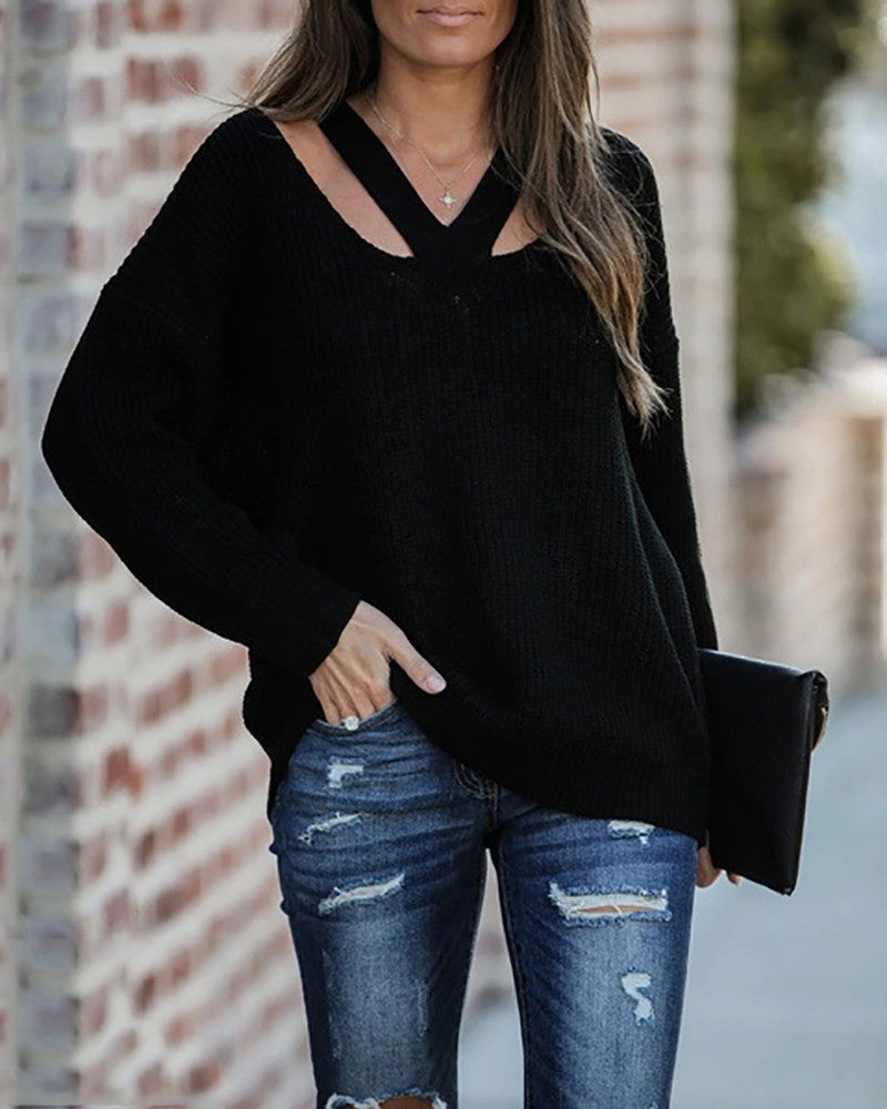 Cutout V Neck Drop Shoulder Sweater