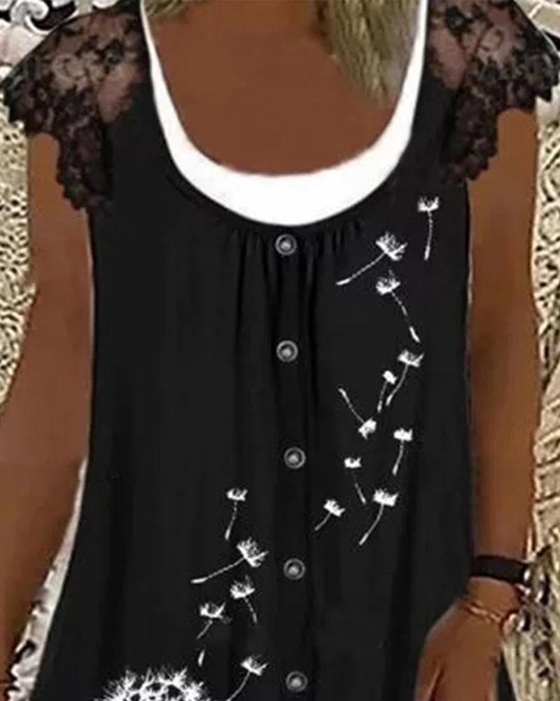 Dandelion Print Contrast Lace Casual Dress