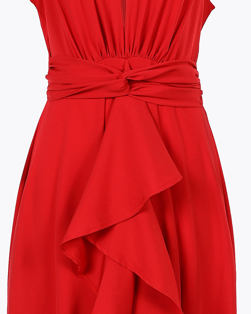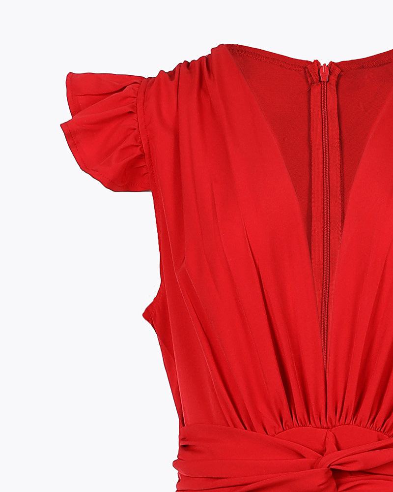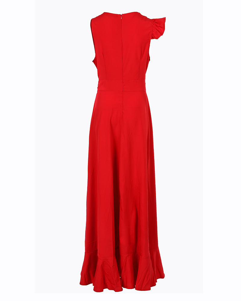Deep V Neck Ruffle Hem Slit Prom Dress