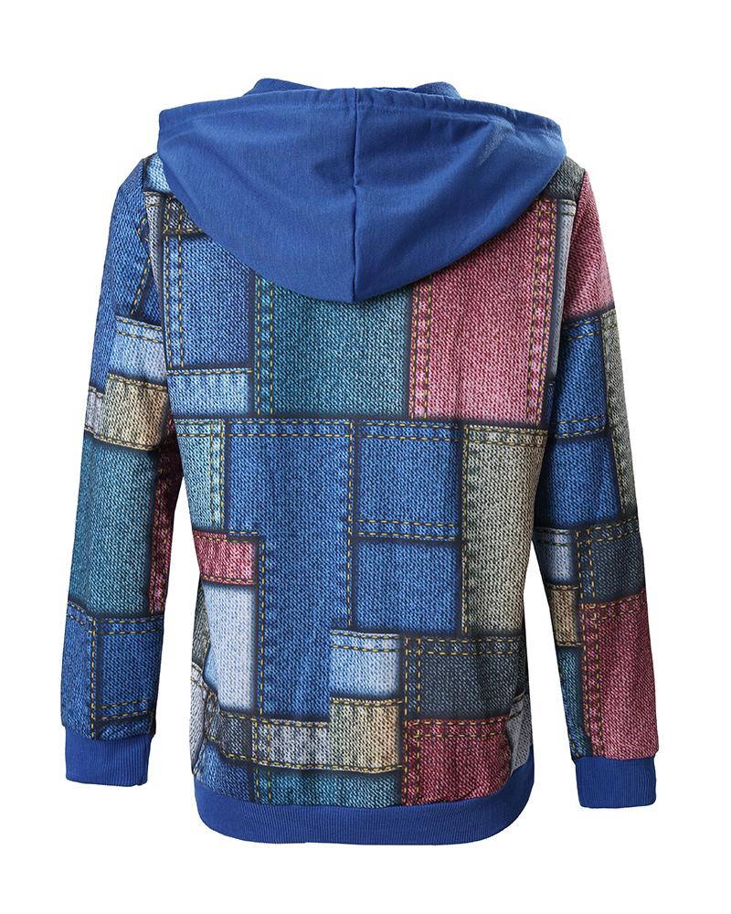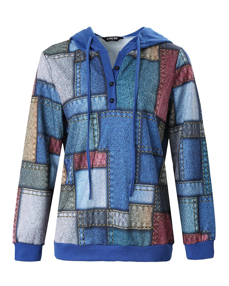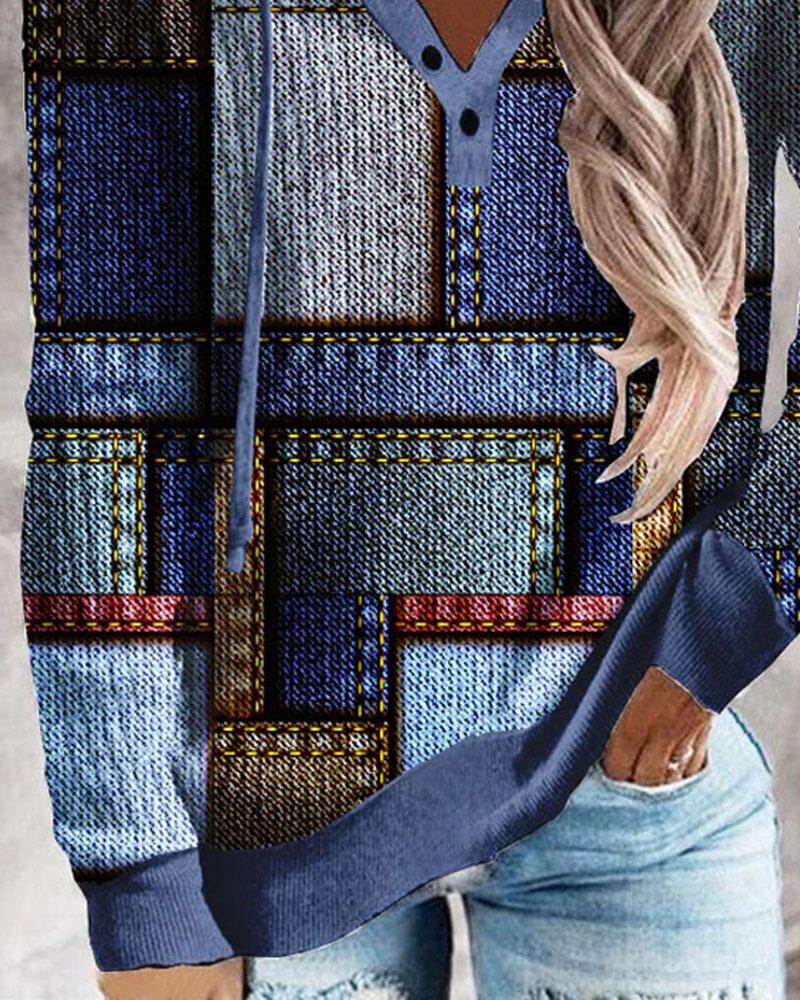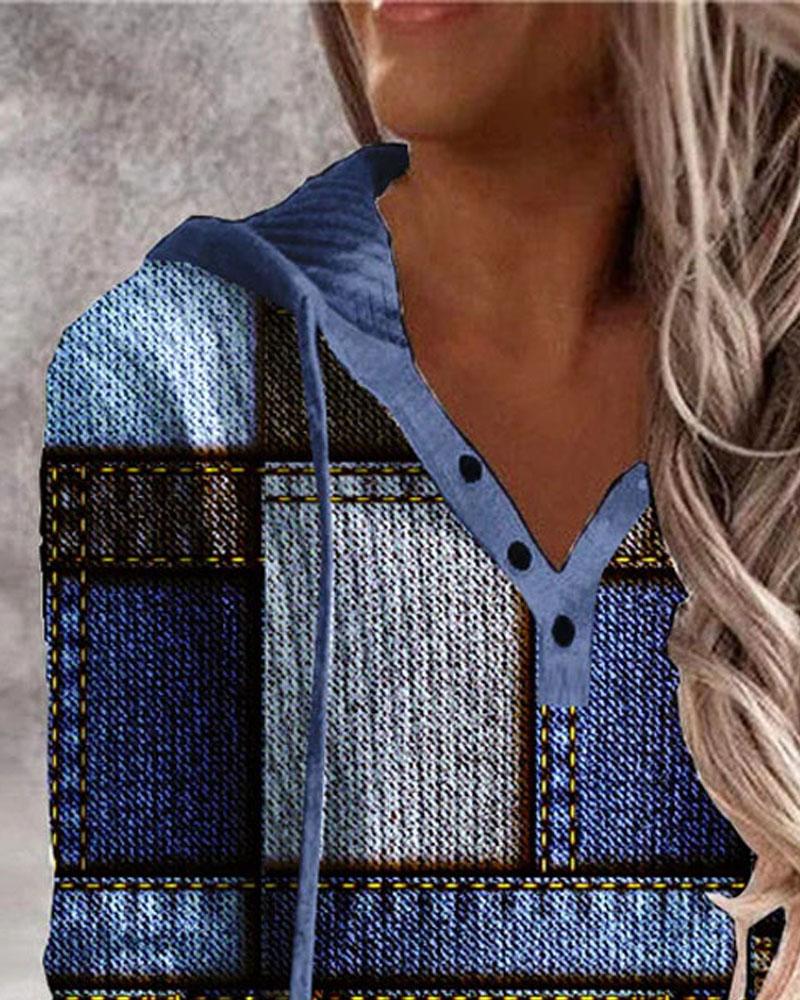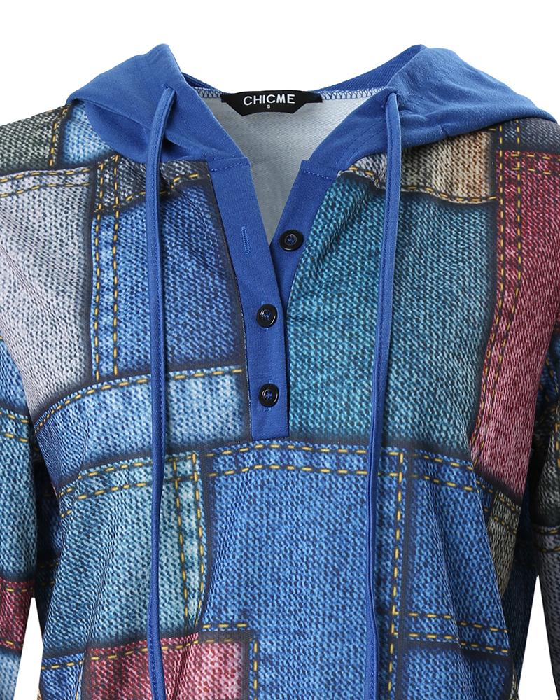 Denim Look Print Button Front Long Sleeve Hoodie