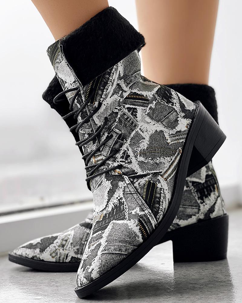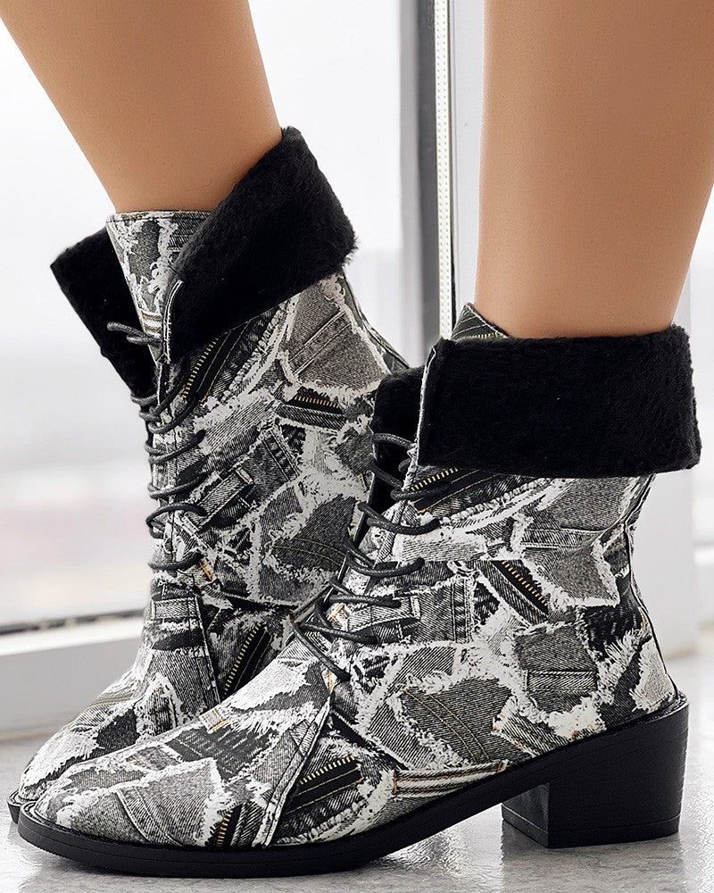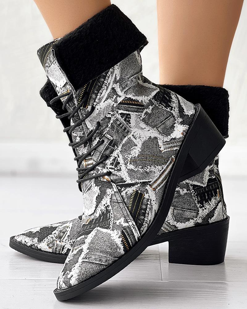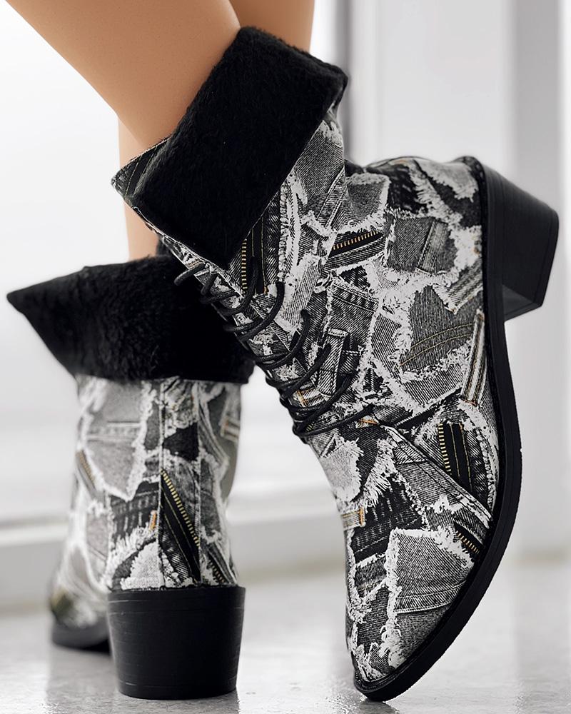 Denim Look Print Lined Chunky Heel Ankle Boots