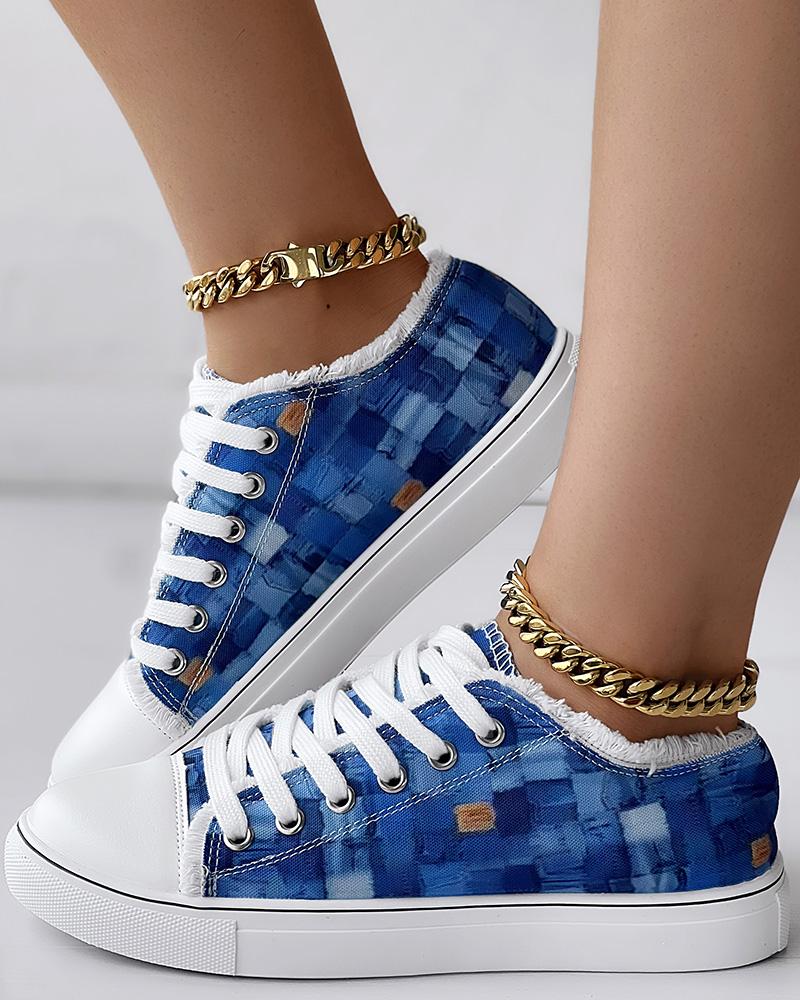 Denim Look Print Raw Hem Eyelet Lace up Sneakers