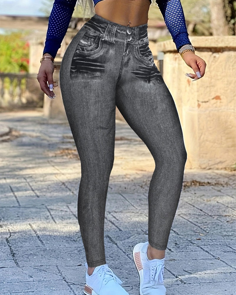 Denim Print High Waist Fake Jean Leggings Seamless Yoga Pants Butt Lifting Workout Trousers