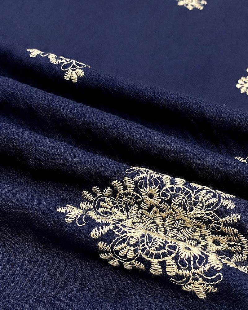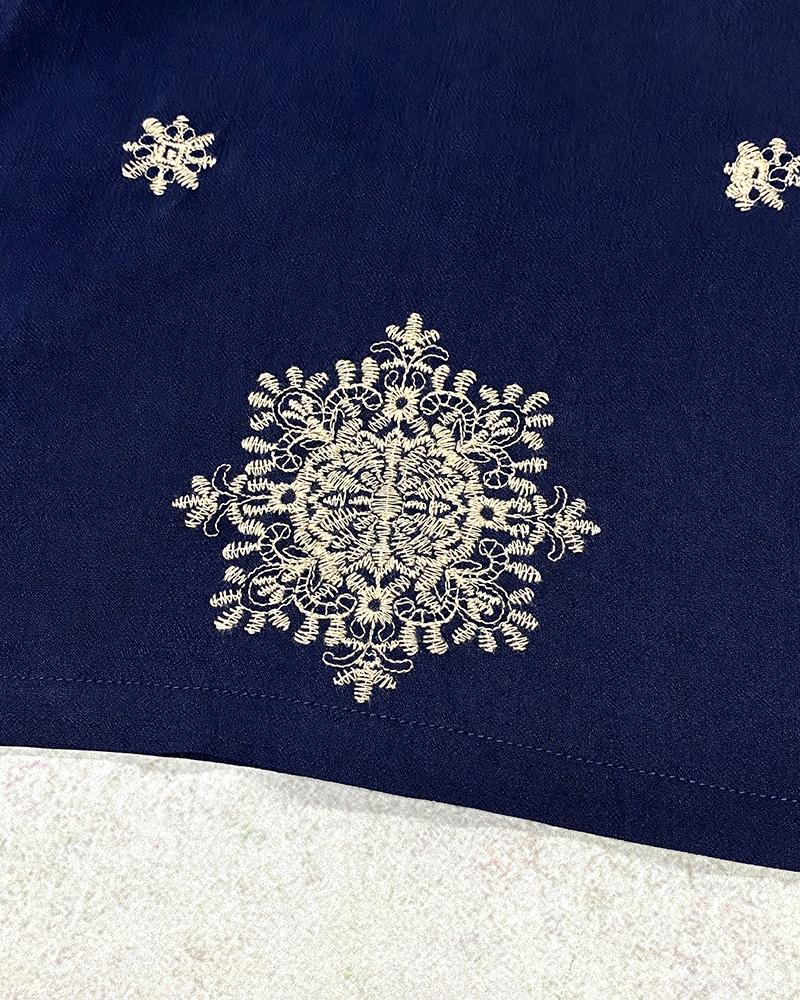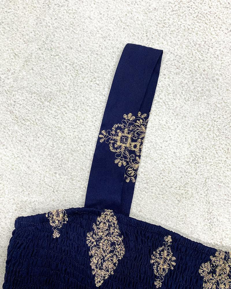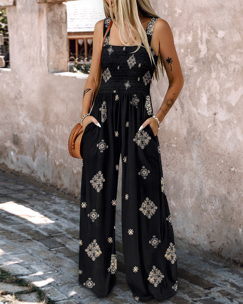 Embroidery Patchwork Thick Strap Square Neck Shirred Jumpsuit Wide Leg Vacation Overalls with Pockets