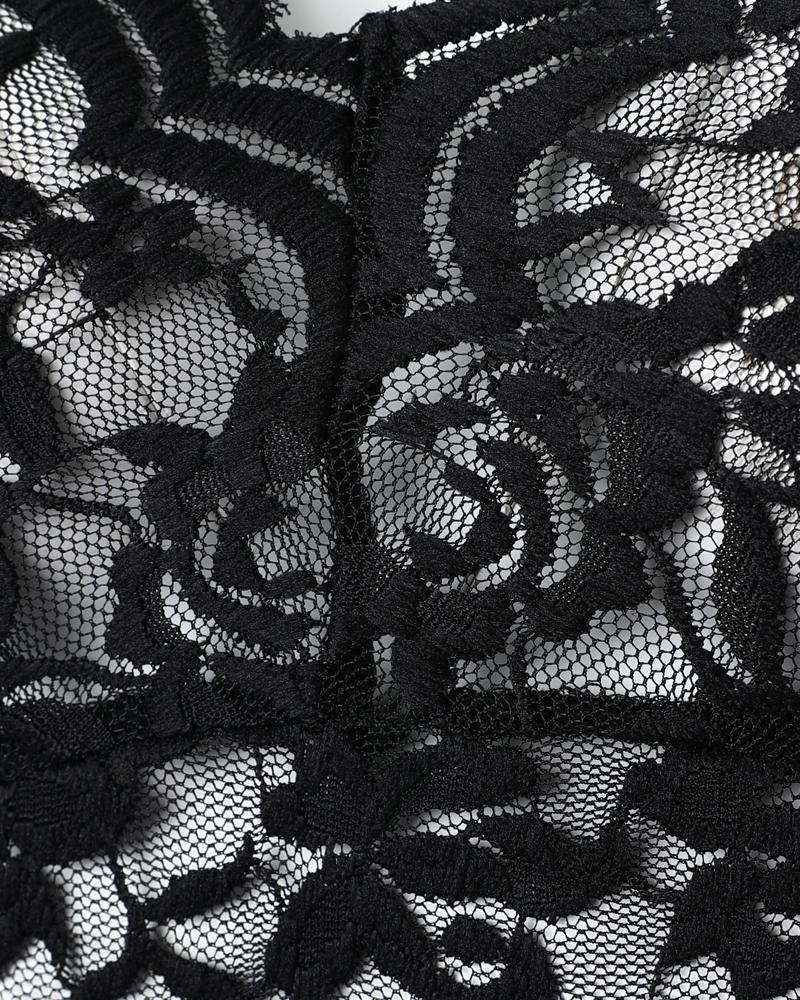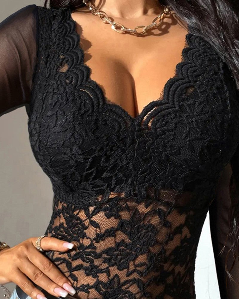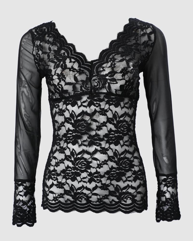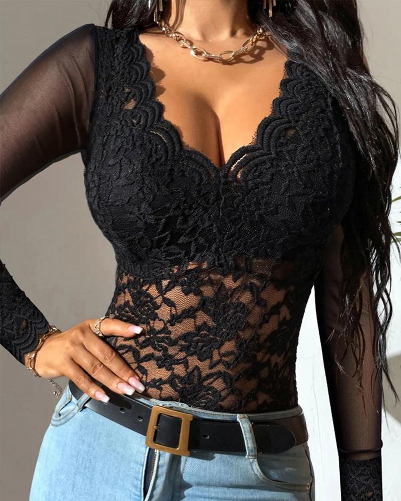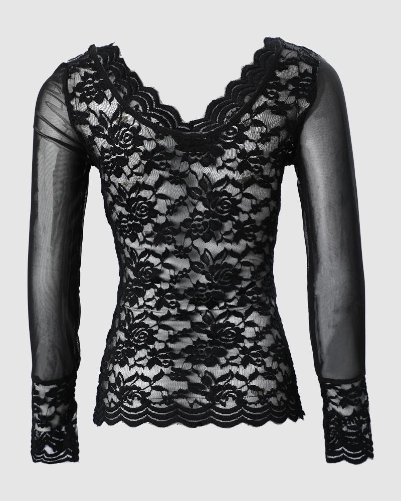 Embroidery Sheer Mesh Lace Long Sleeve Top