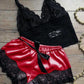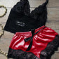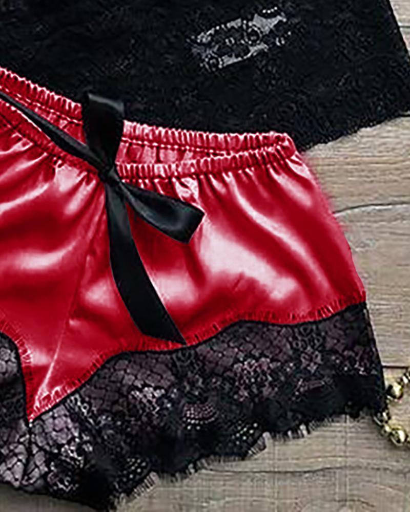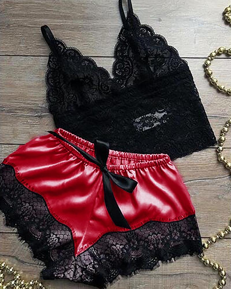 Eyelash Crochet Lace Satin Bowknot Cami Set