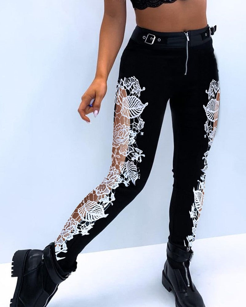 Eyelet Buckled Lace Patch Zipper Design Pants