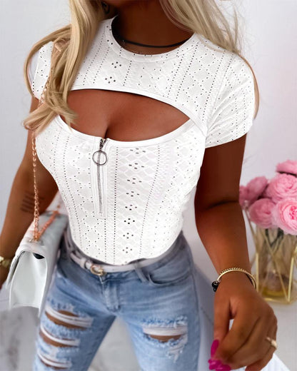 Eyelet Embroidery Cutout Zipper Decor T Shirt