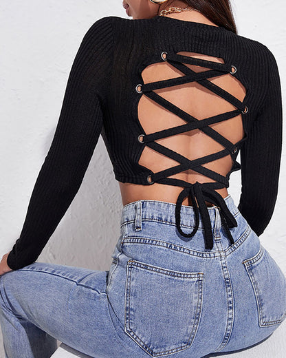 Eyelet Lace Up Long Sleeve O Neck Crop Top