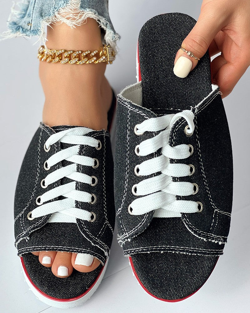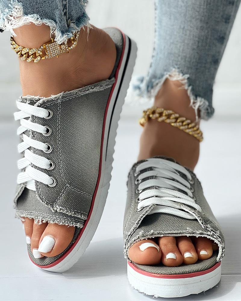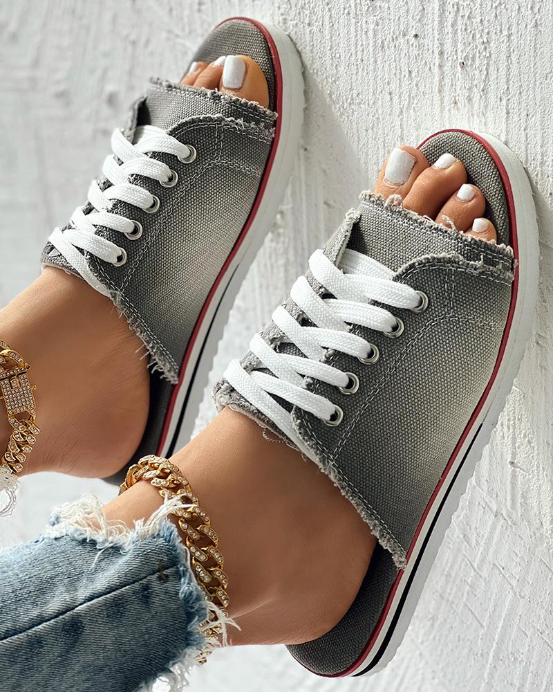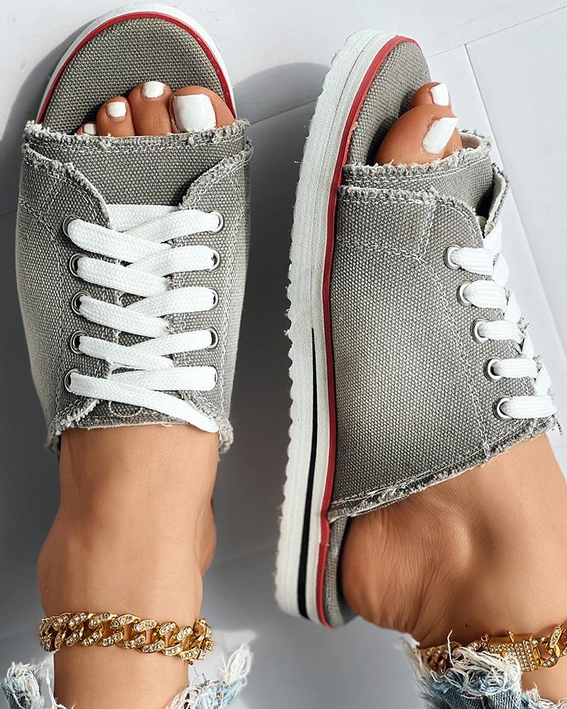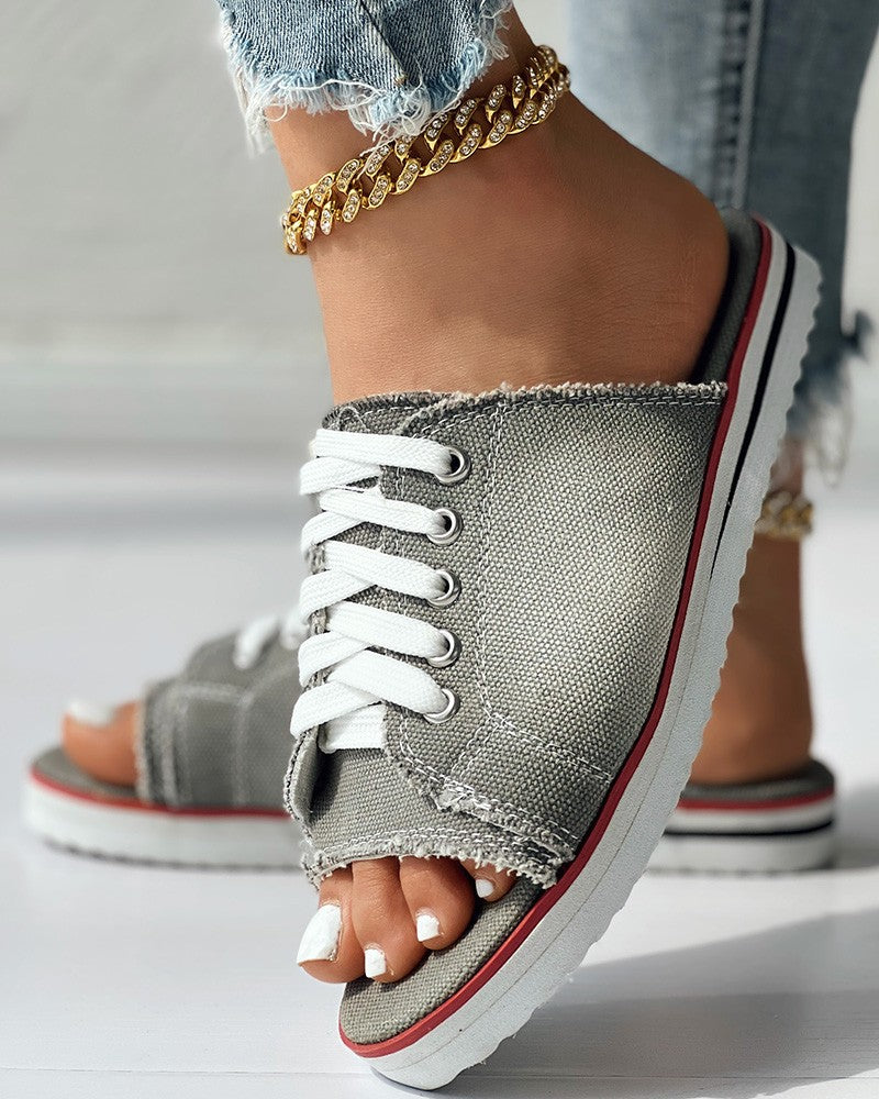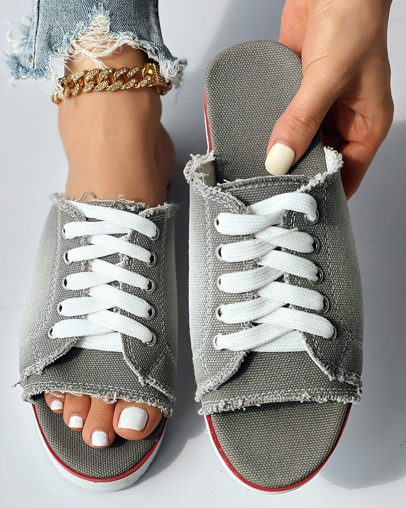 Eyelet Lace up Peep Toe Fringe Hem Slippers