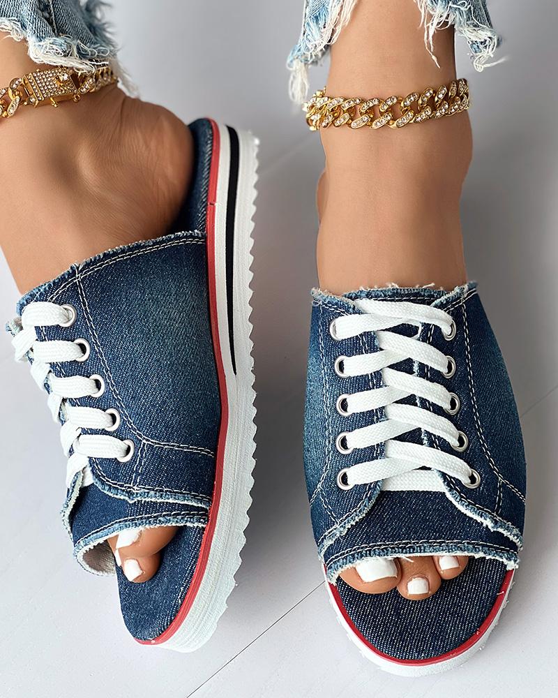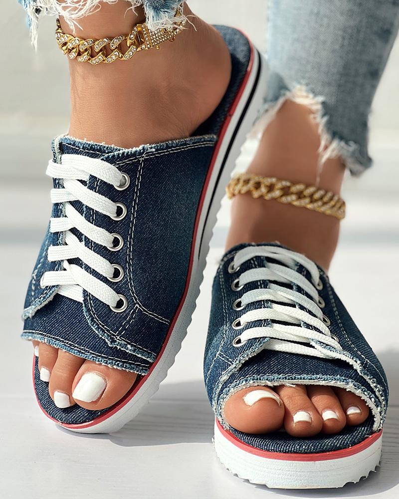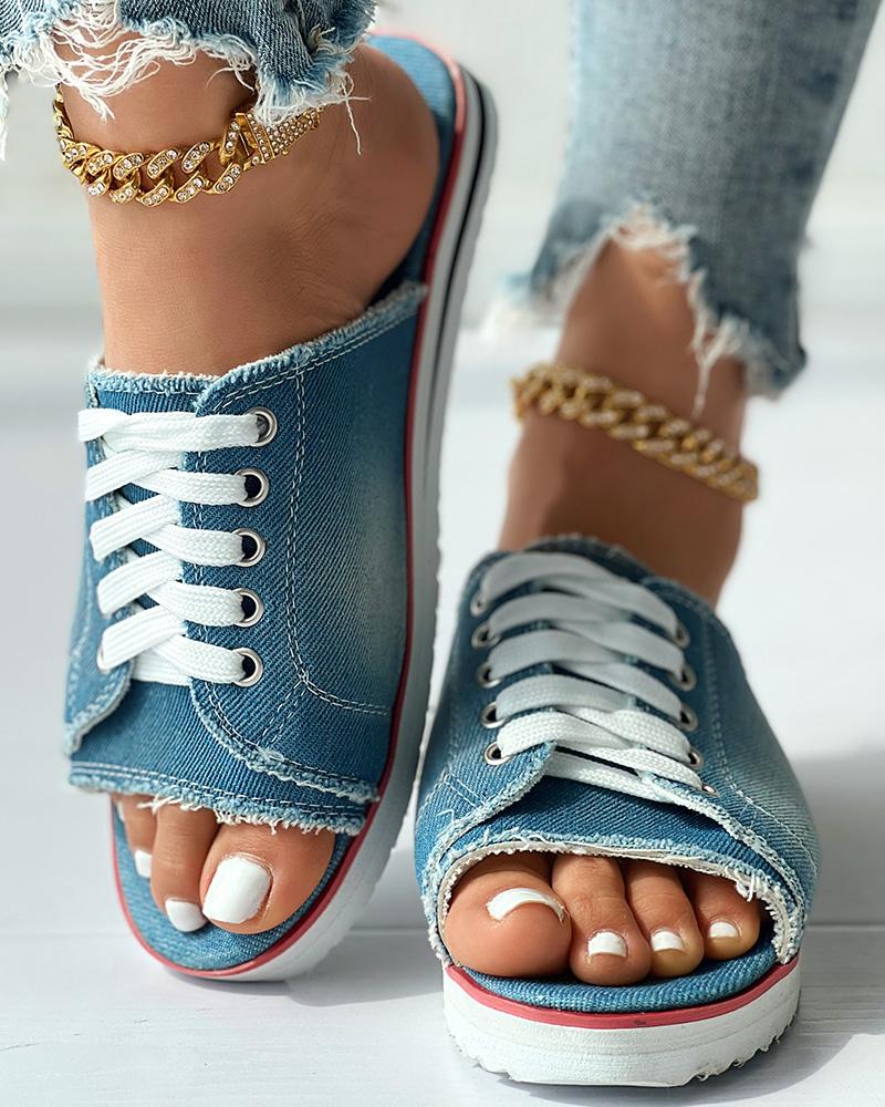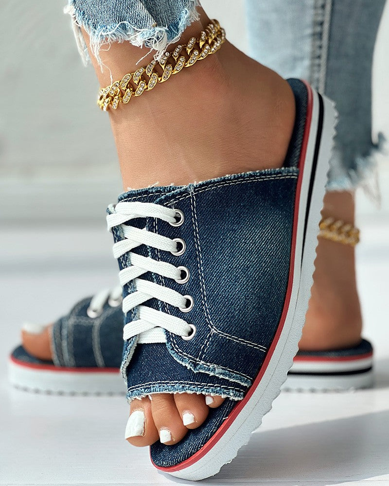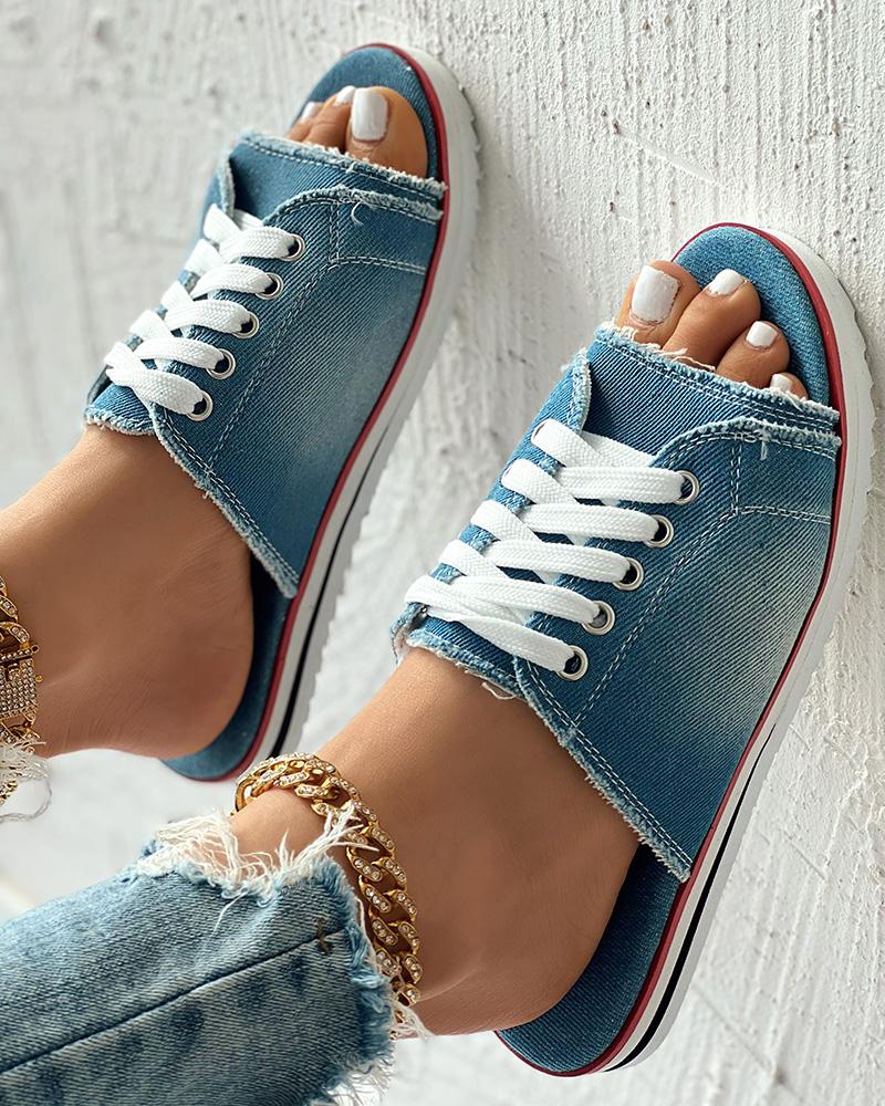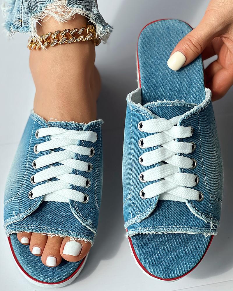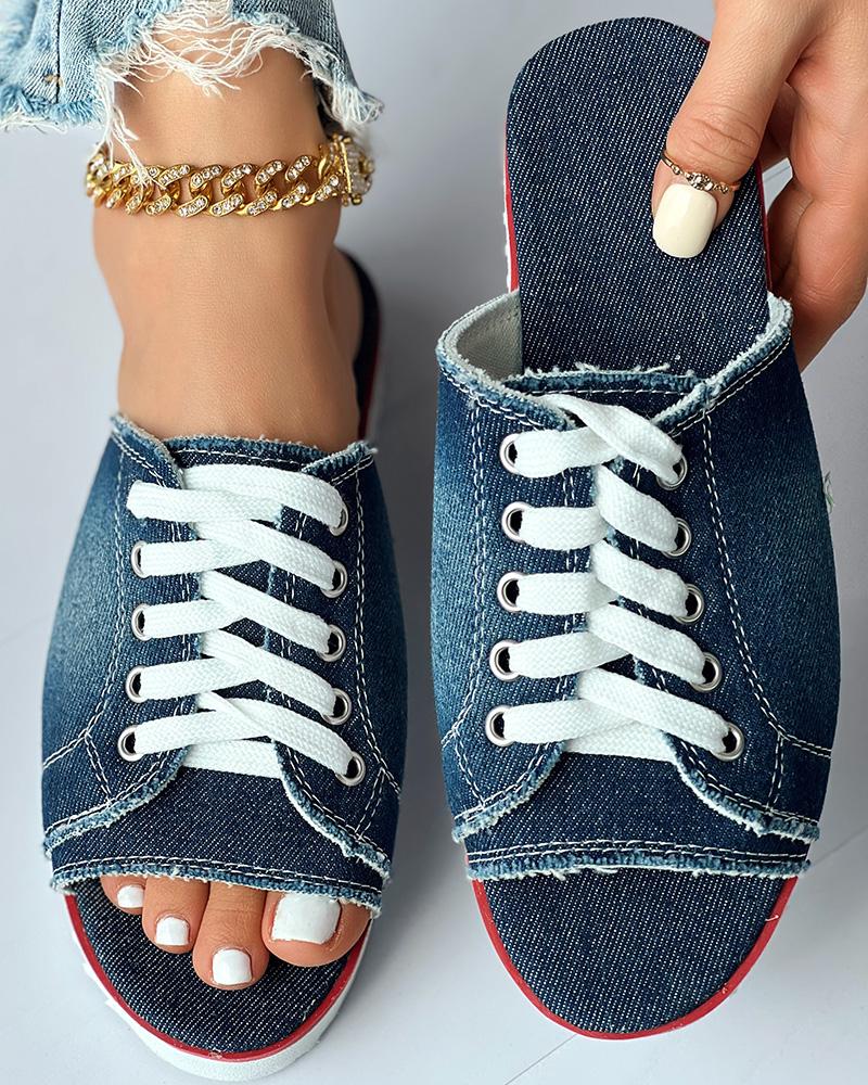 Eyelet Lace up Peep Toe Fringe Hem Slippers