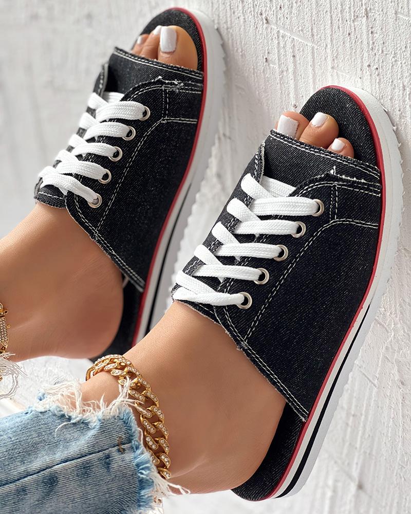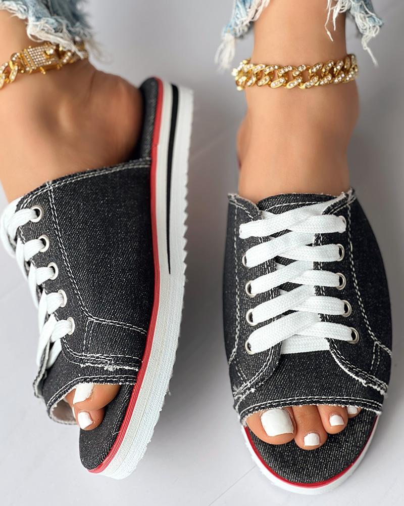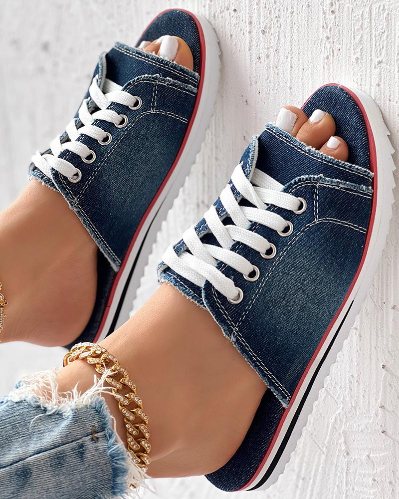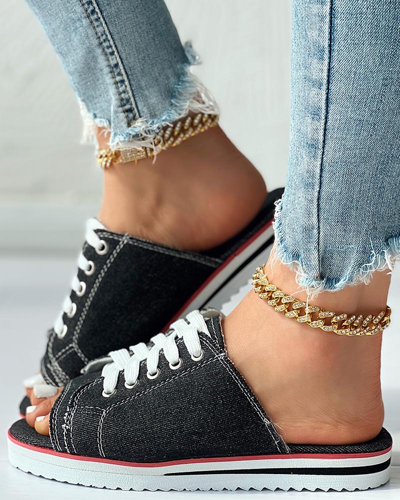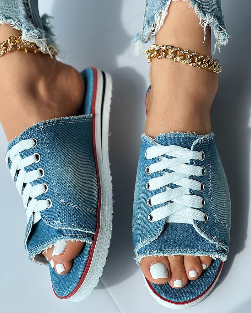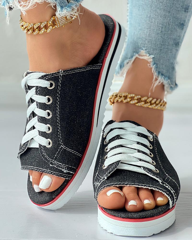 Eyelet Lace up Peep Toe Fringe Hem Slippers