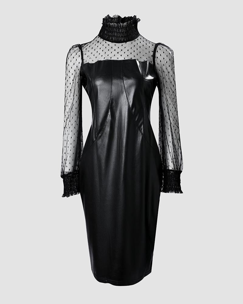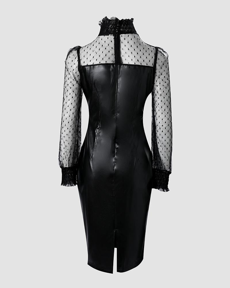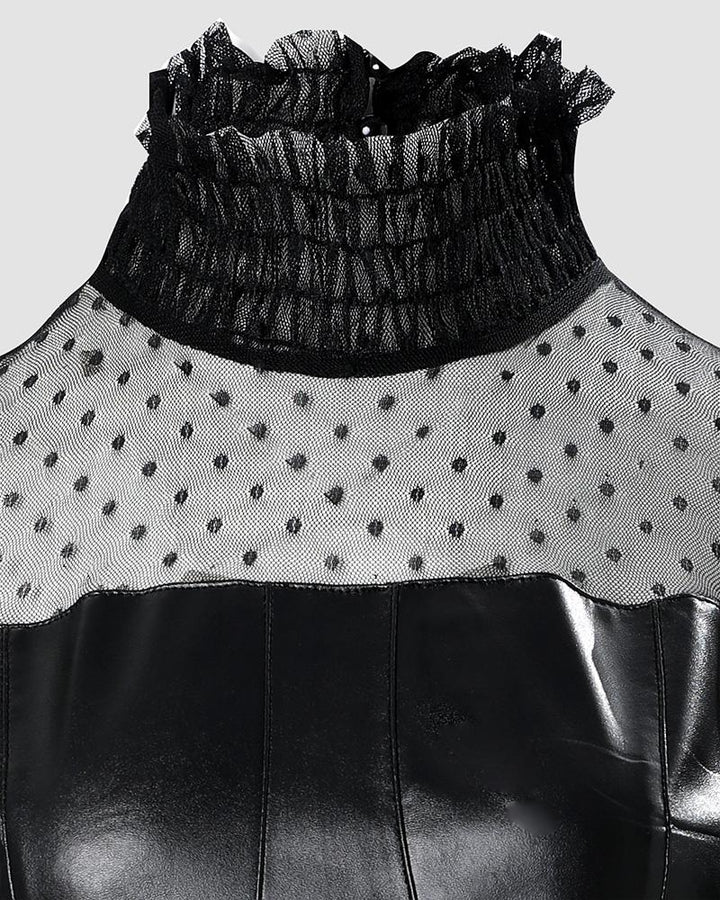 Faux Leather Dot Mesh Puff Lantern Sleeve Party Dress