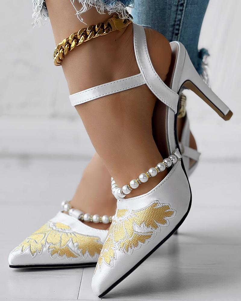 Floral Embroidery Pearl Decor Stiletto Heeled Pumps