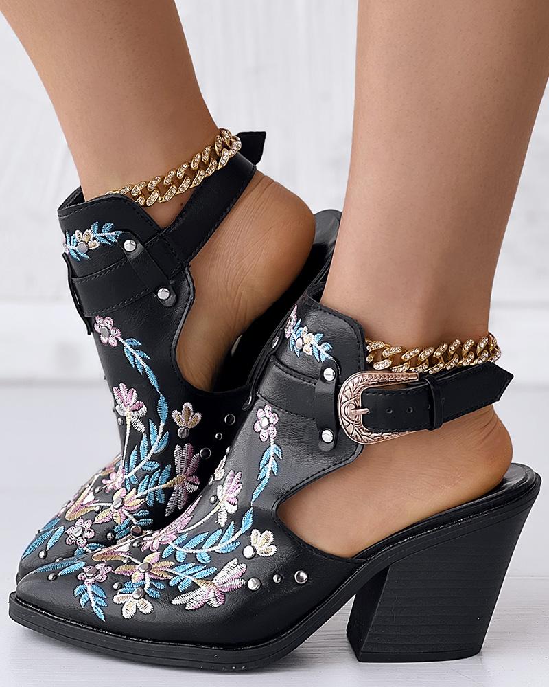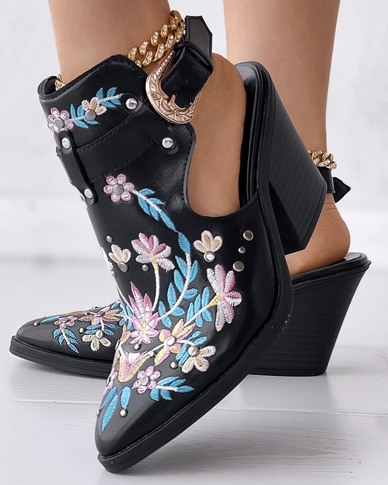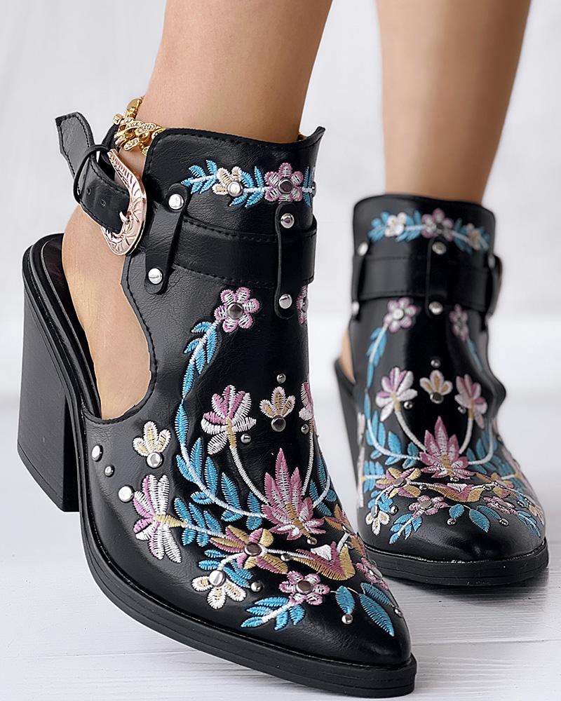Floral Embroidery Studded Slingback Buckled Boots
