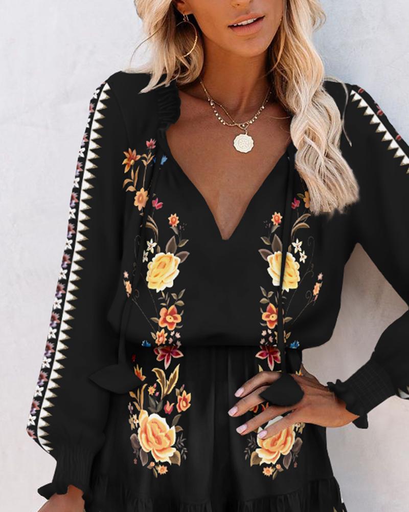 Floral Geometric Print V Neck Long Sleeve Mini Dress Ruffle Hem Tied Detail Casual Dress