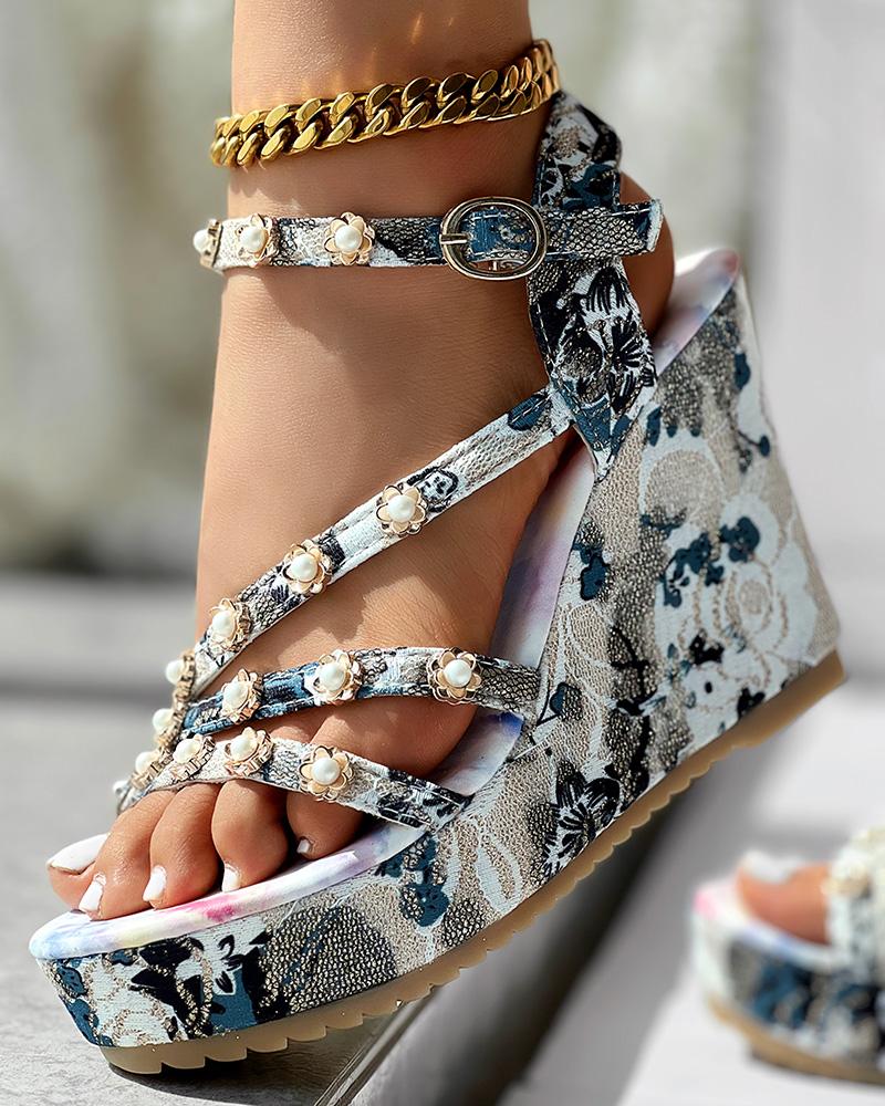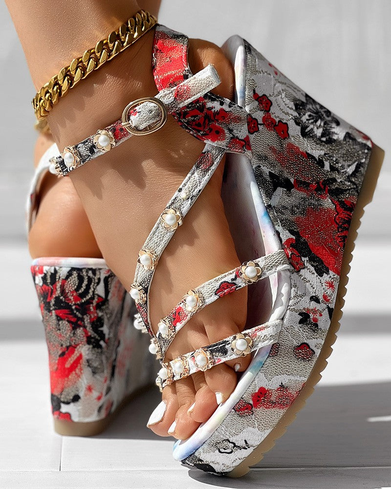 Floral Pearls Decor Platform Ankle Strap Wedge Sandals