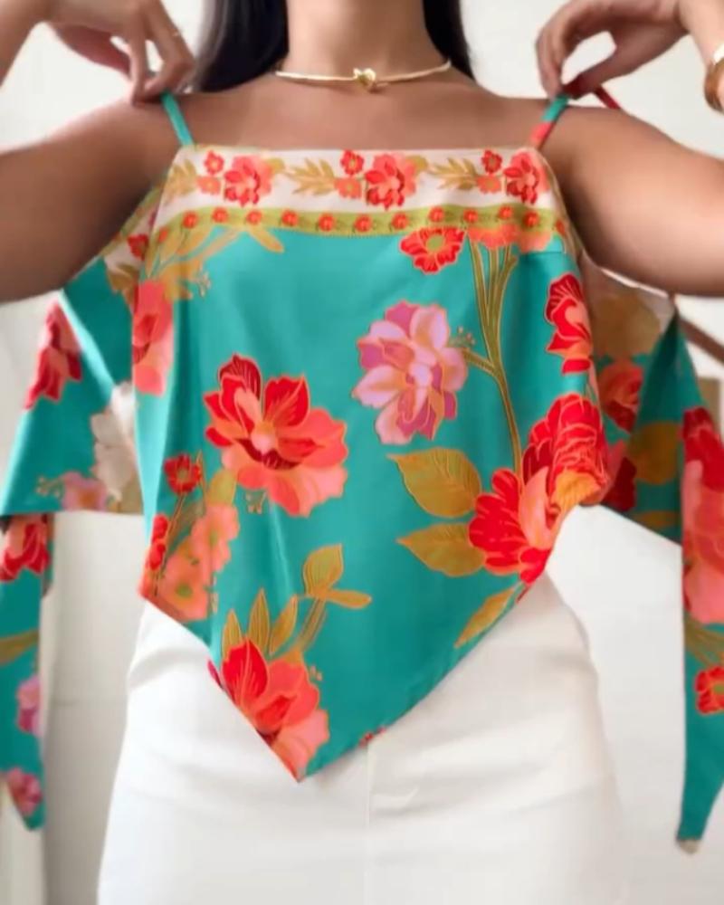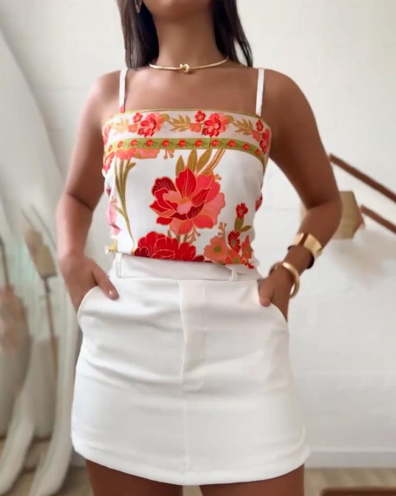 Floral Print Bandeau Spaghetti Strap Tank Casual Back Tied Detail Asymmetrical Hem Top