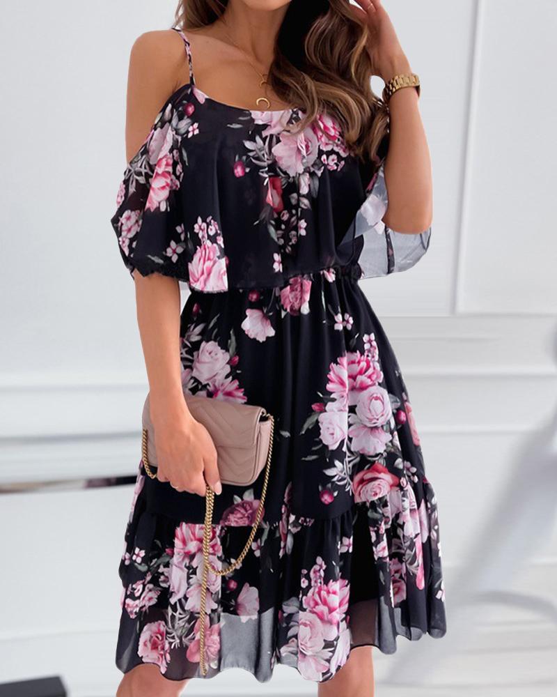 Floral Print Cold Shoulder Ruffle Hem Chiffon Dress