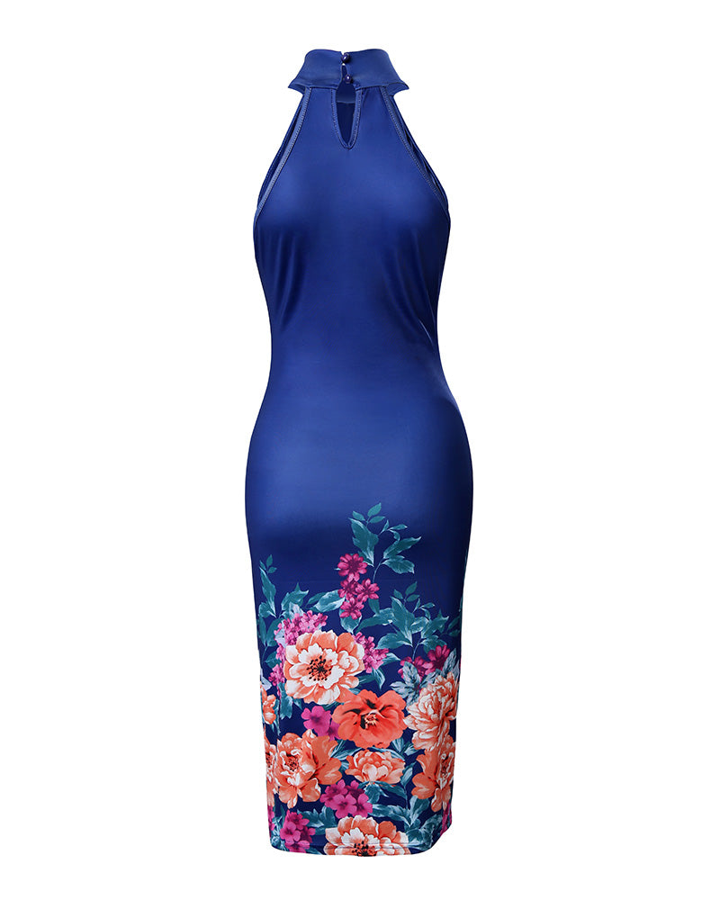 Floral Print High Neck Sleeveless Bodycon Dress