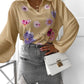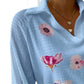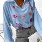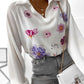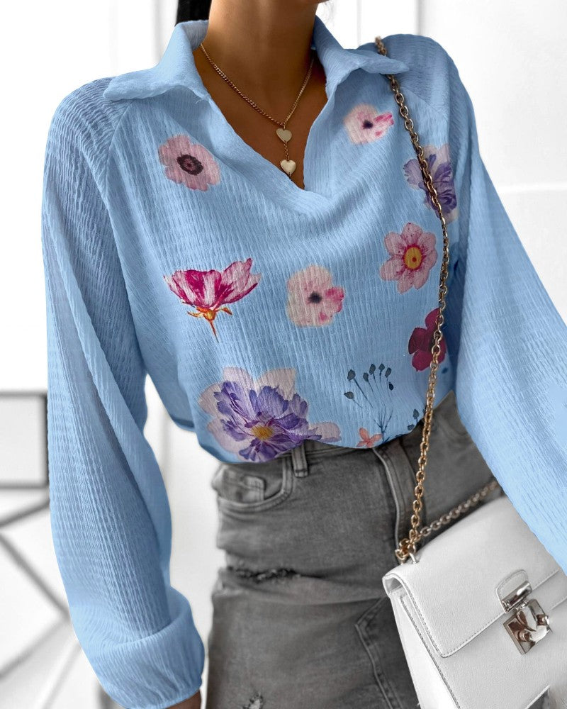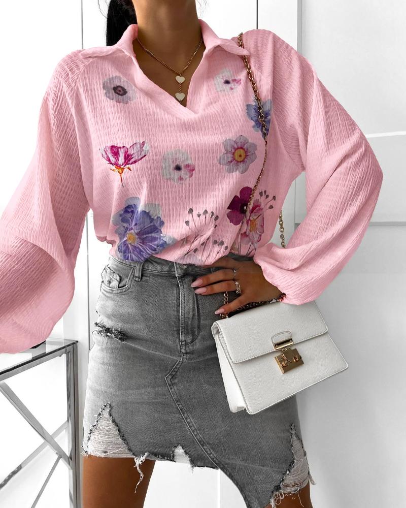 Floral Print Polo Collar Long Sleeve Blouse Casual Pullover Shirt Top