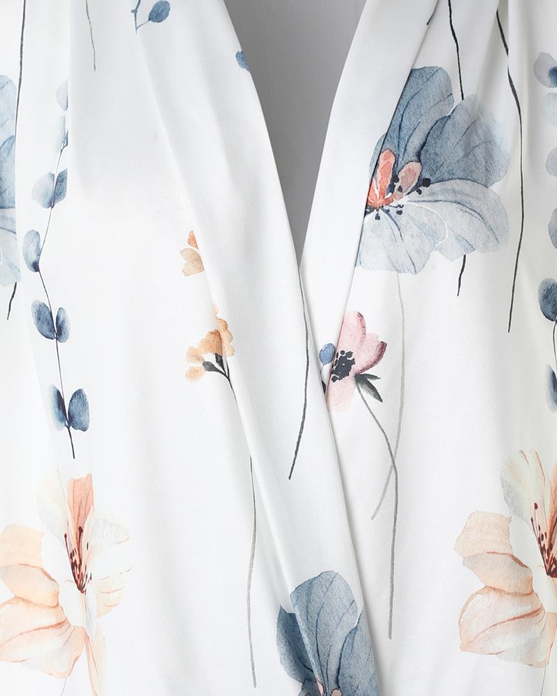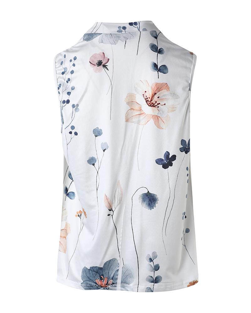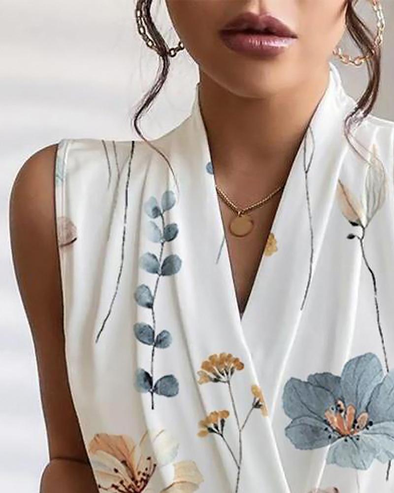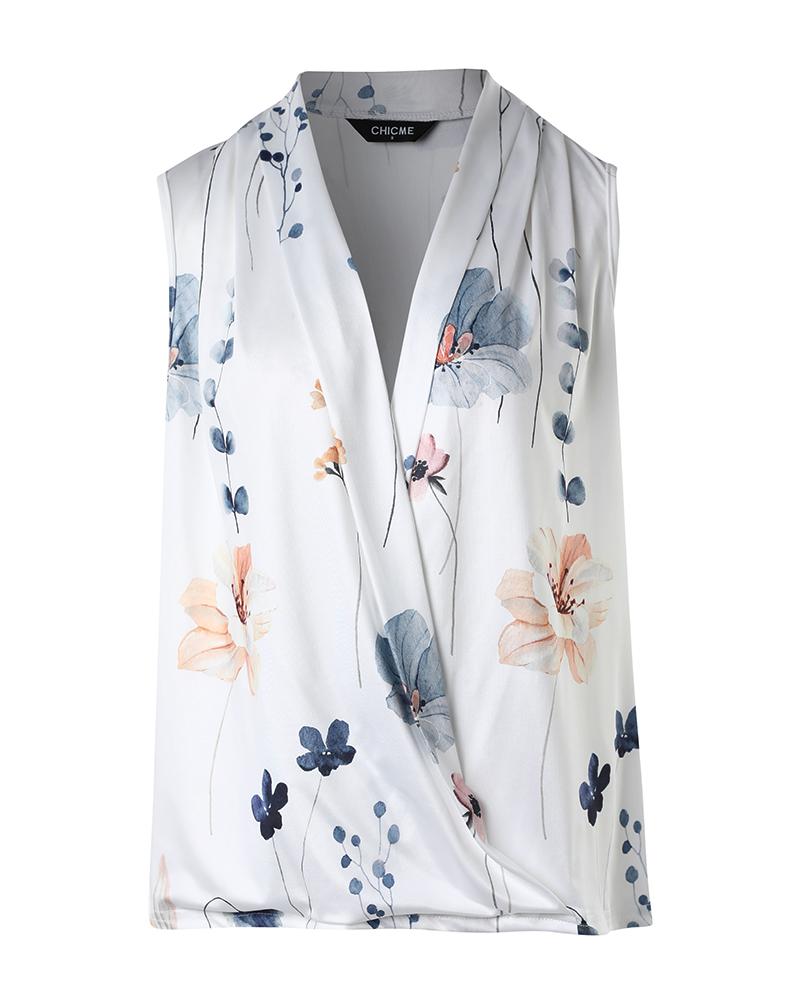 Floral Print Ruched V Neck Sleeveless Wrap Top