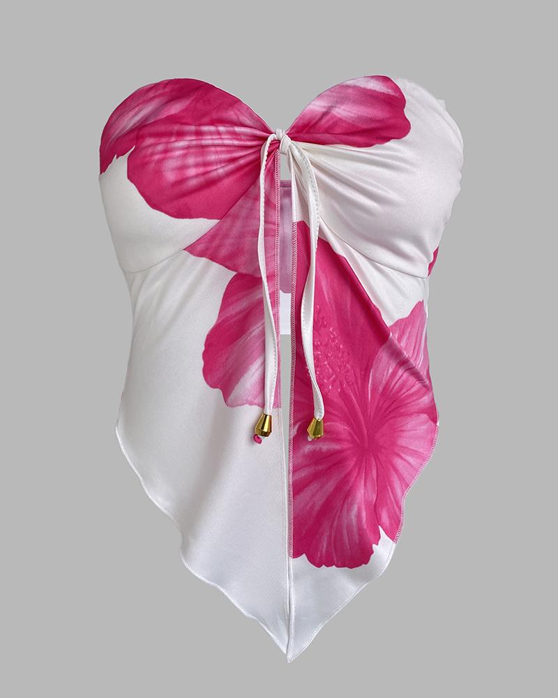 Floral Print Strapless Tied Top /w Ruched Mini Skirt Set Two Piece Outfit