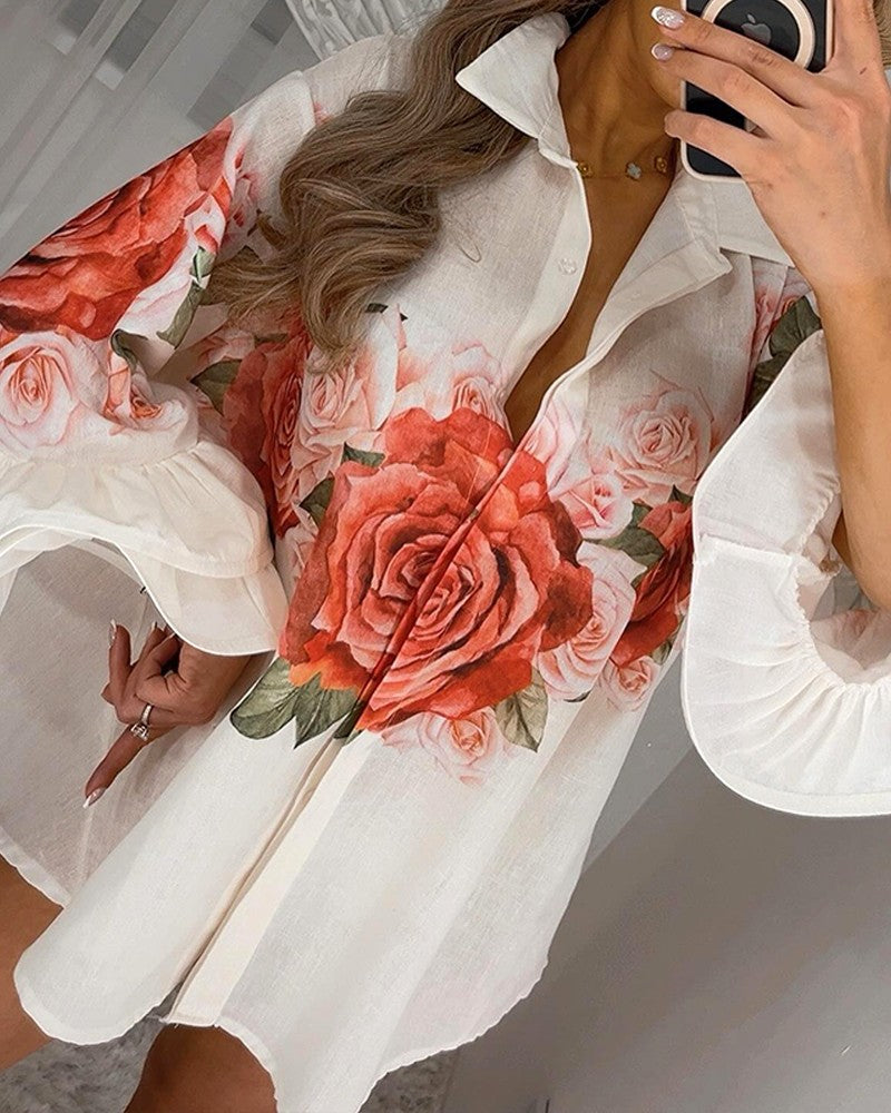Floral Print Turn down Collar Bell Sleeve Front Button Blouse Vacation Shirt