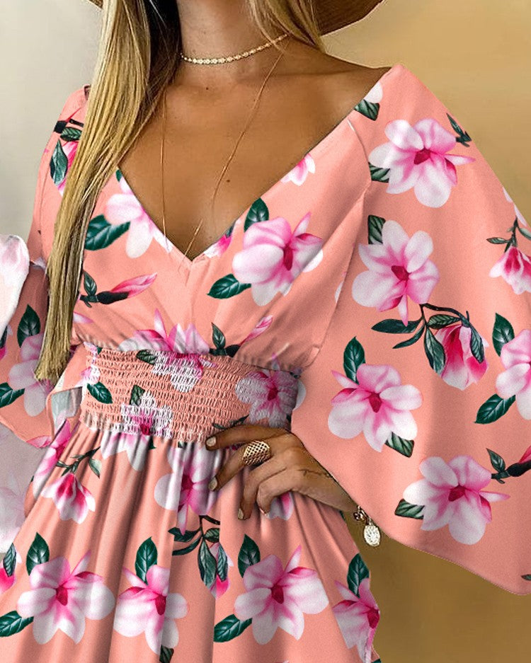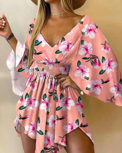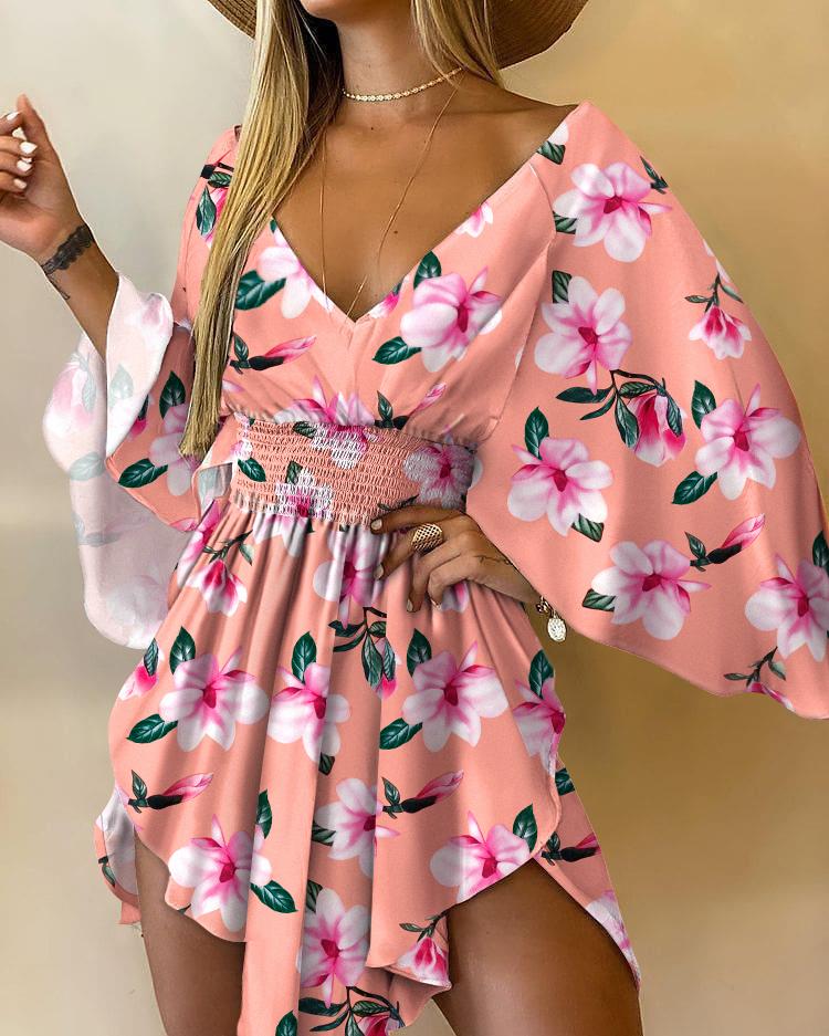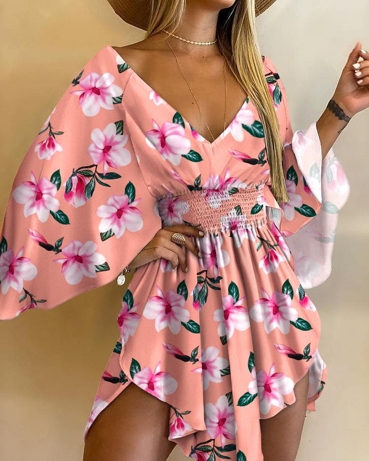 Floral Print V Neck Batwing Sleeve Shirred Waist Mini Dress