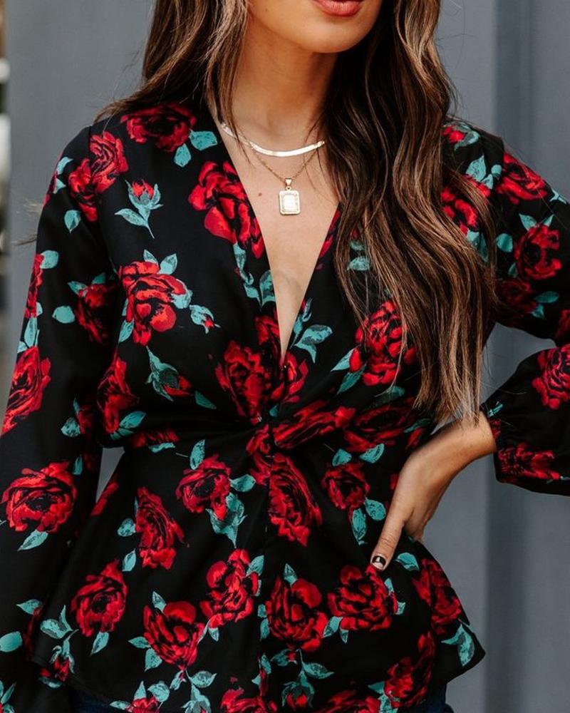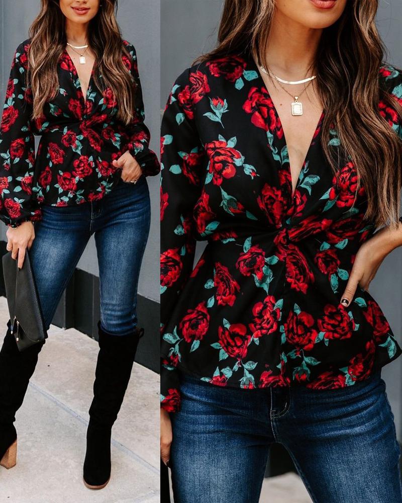 Floral Print V Neck Long Sleeve Top
