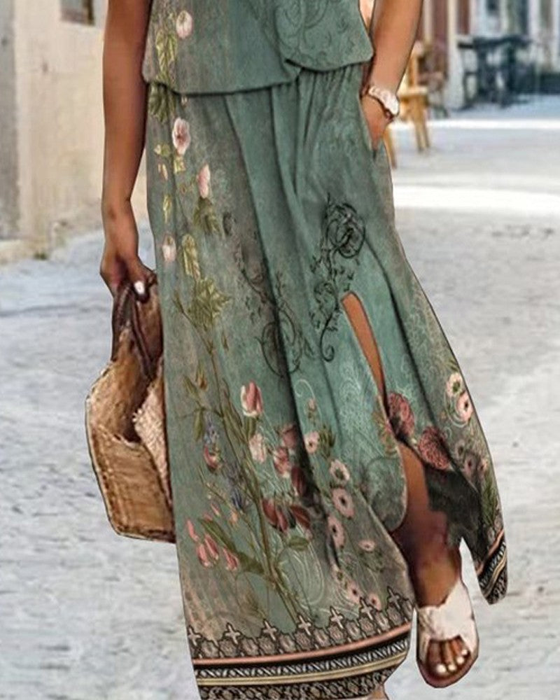 Floral Tribal Print Sleeveless Slit Casual Dress