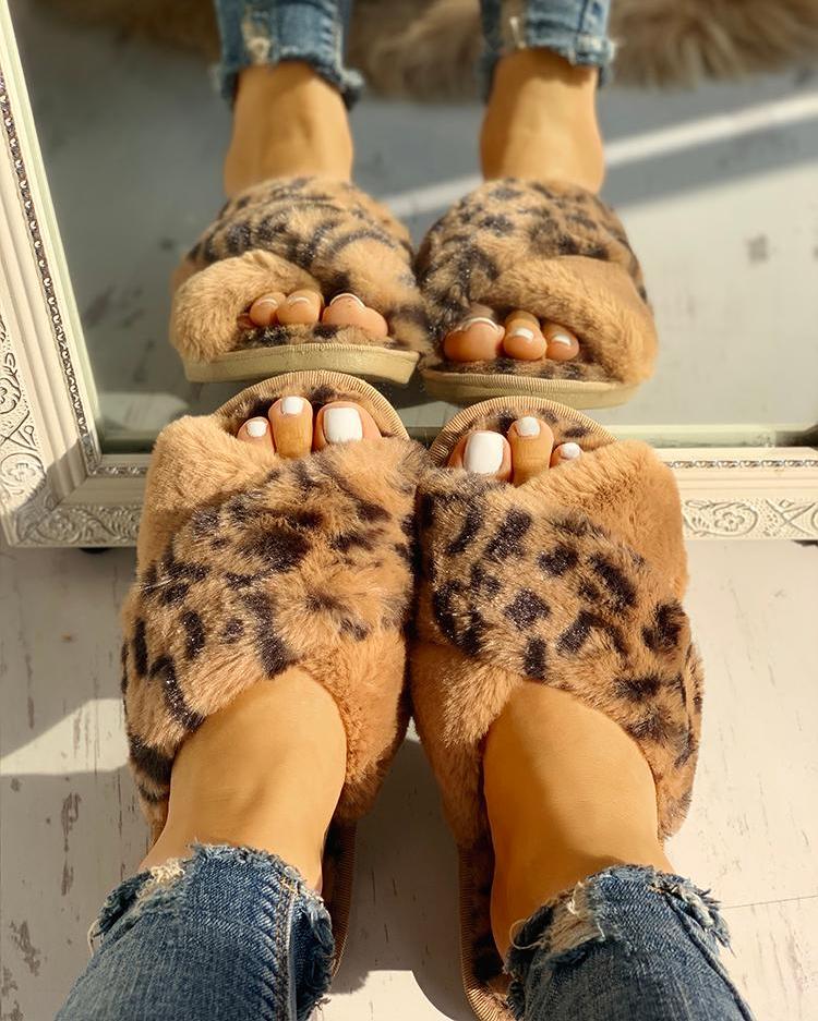 Fluffy Leopard Crisscross Peep Toe Slippers
