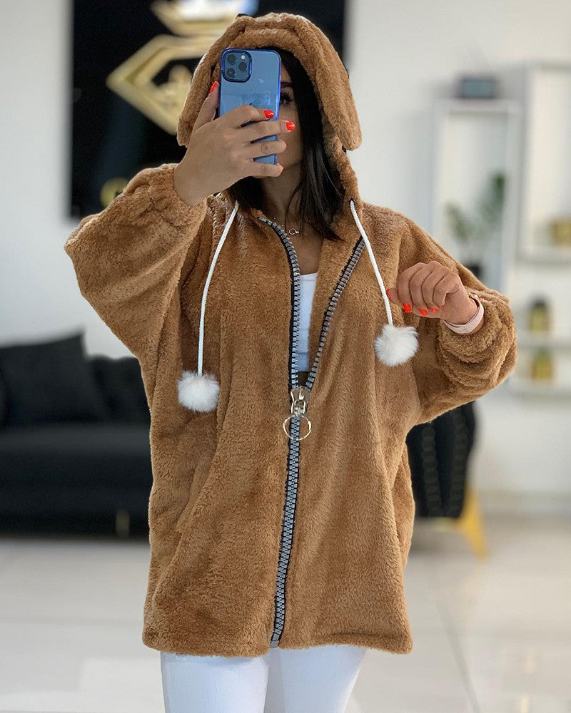 Fluffy Puppy Ear Hooded Zipper Design Fleece Teddy Coat