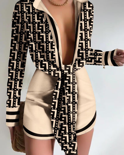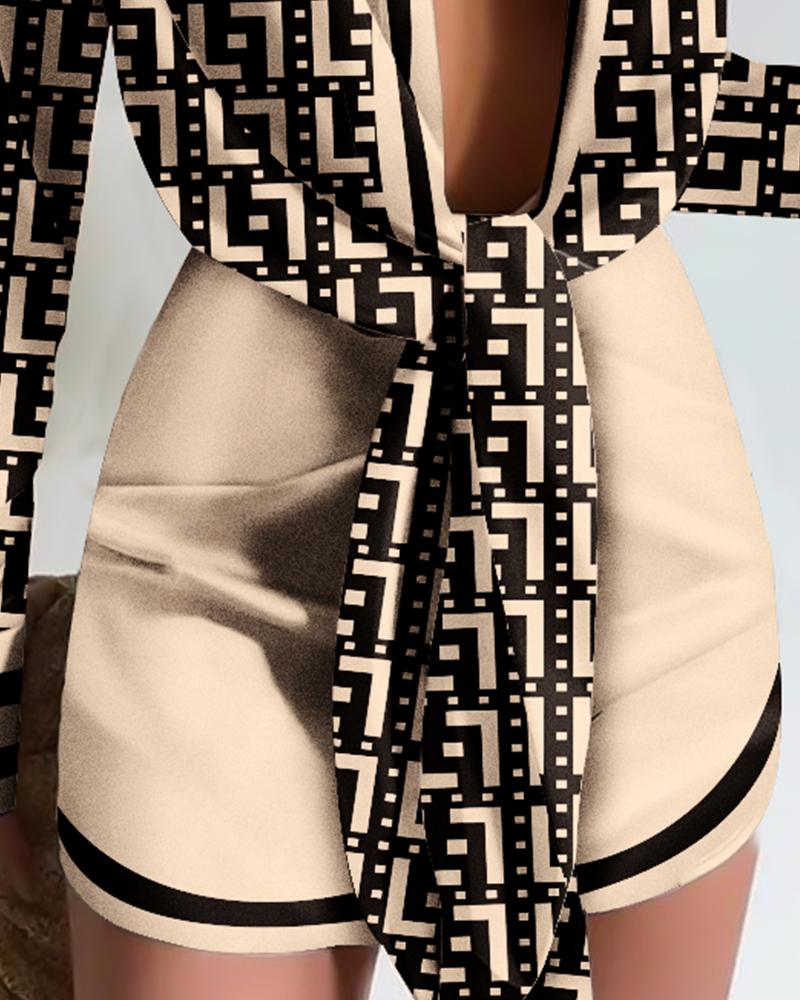 Geo Print Tied Detail Long Sleeve Shirt Dress
