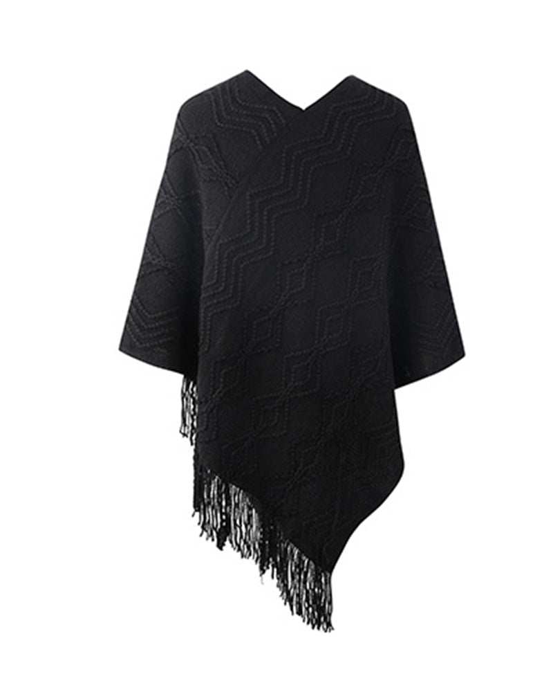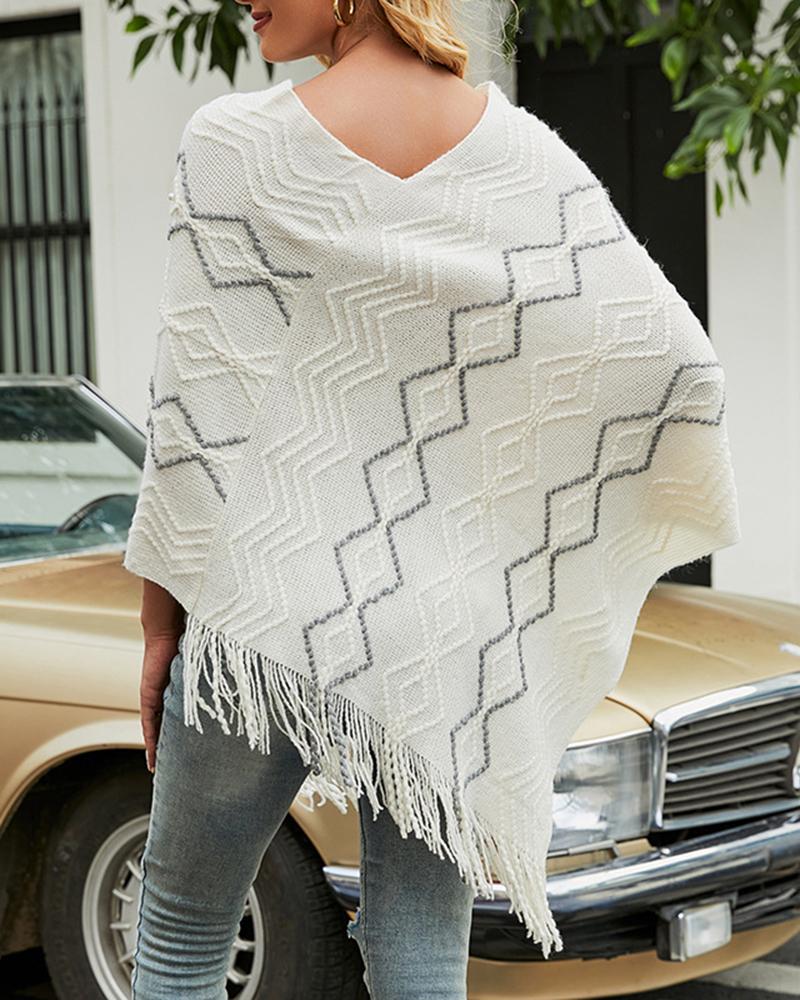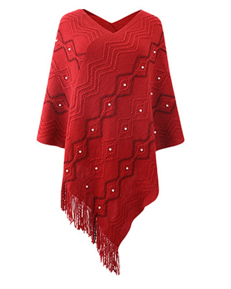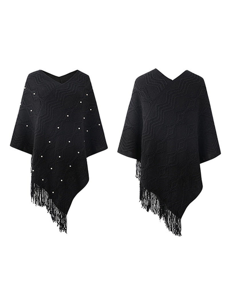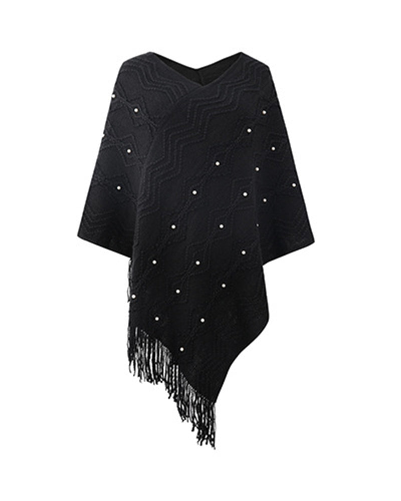 Geometric Pattern Pearls Decor Tassel Design Knit Cape Sweater