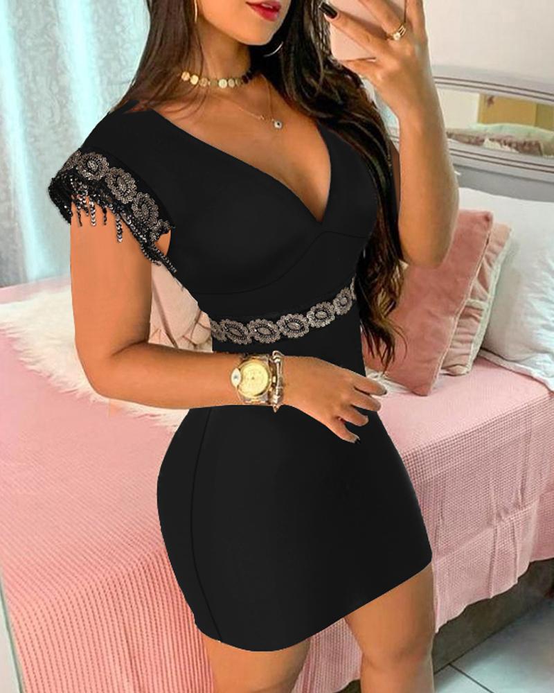 Geometric Pattern Sequin Tassel Design Bodycon Dress V Neck Slim Fit Mini Party Dress