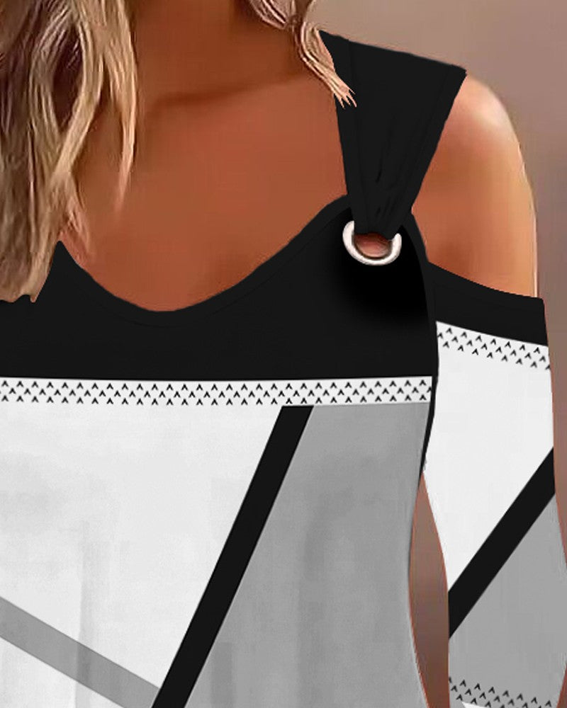 Geometric Print Cold Shoulder Eyelet Casual Top
