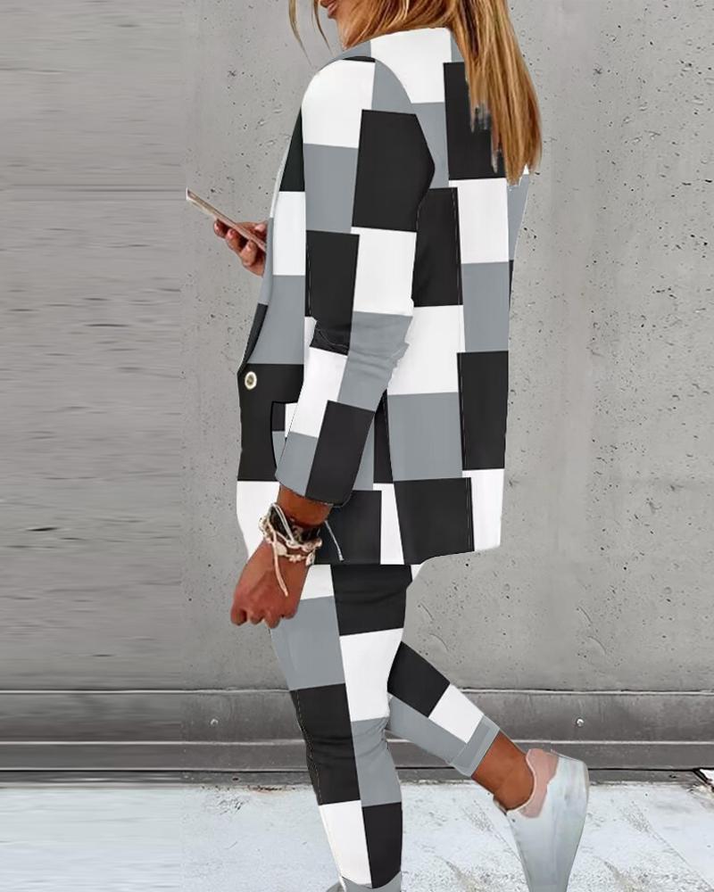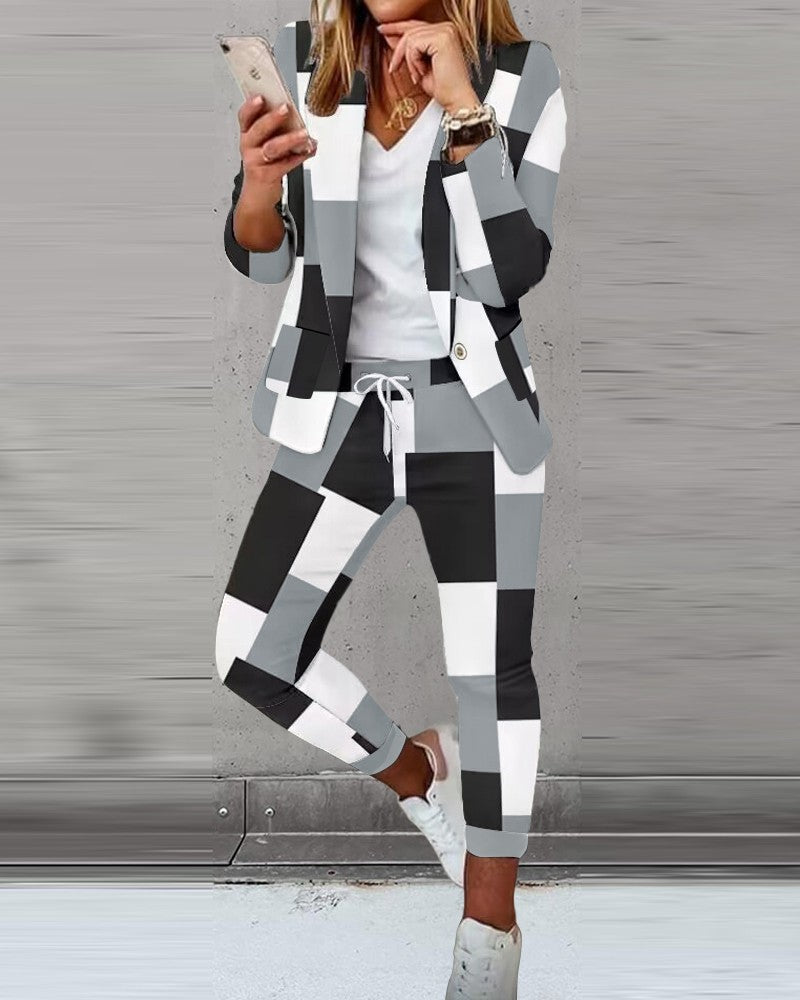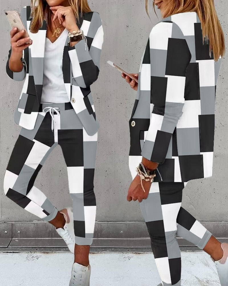 Geometric Print Colorblock Blazer Coat & Drawstring Pants Set