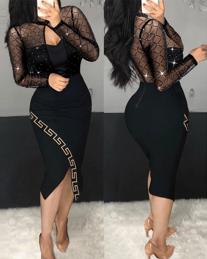 Geometric Print Rhinestone Sheer Mesh Midi Dress