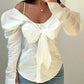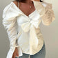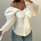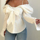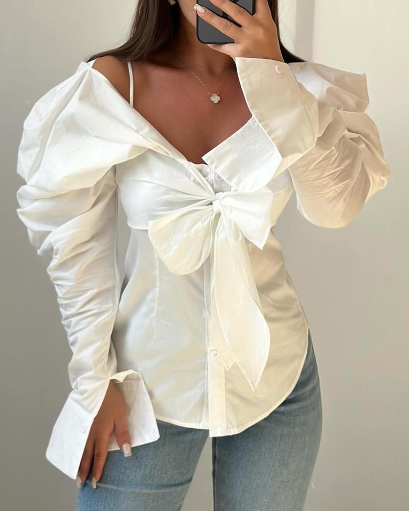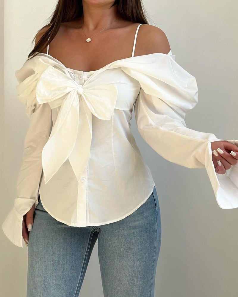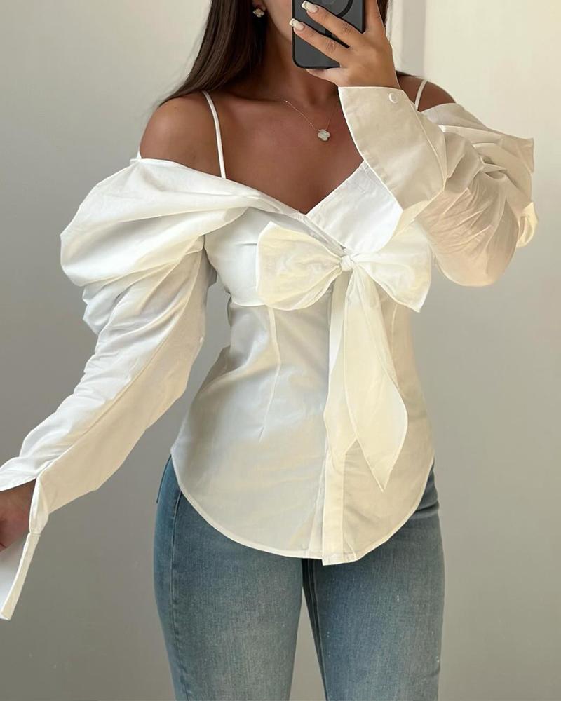 Gigot Sleeve Cold Shoulder Cinched Waist Blouse Bowknot Design Casual Top