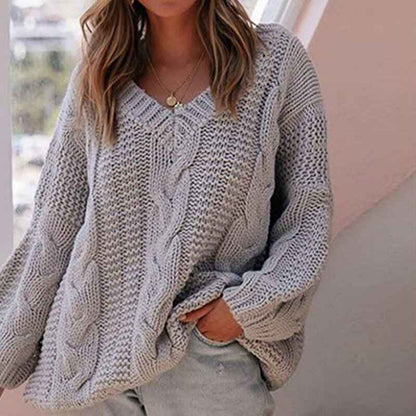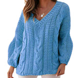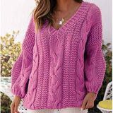 Women's Deep V Neck Sweater Cable Knit Pullover Jumper Casual Long Sleeve Loose Tops Knitwear K045