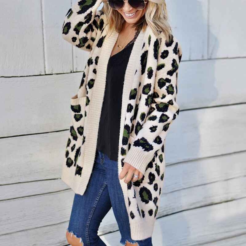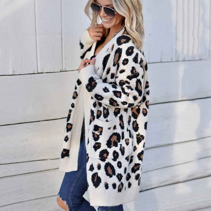 Women Long Sleeve Open Front Leopard Knit Long Cardigan Casual Print Knitted Maxi Sweater Coat Outwear with Pockets K067